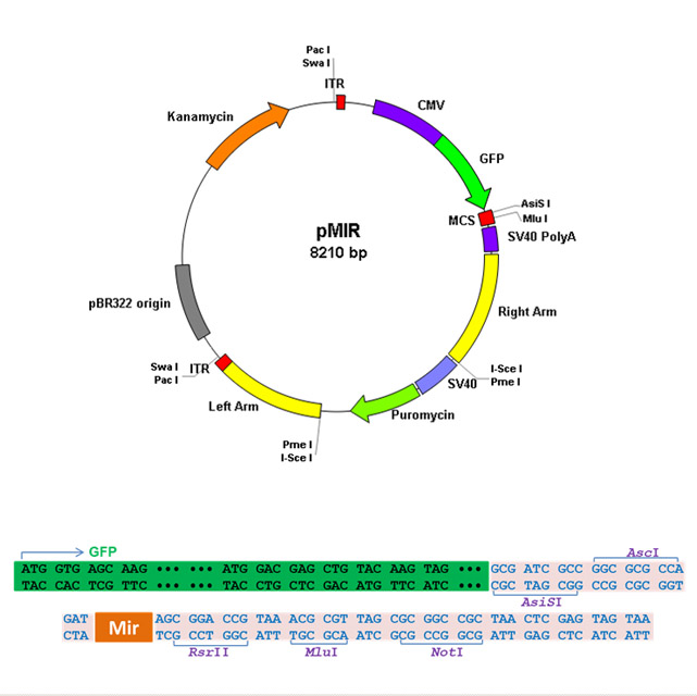 維真生物人源miRNA腺病毒產品數量多、周期短、品質高!pCMV-GFP-pri-hsa-miRNA-SV40 PloyA表達盒的獨特設計便于科研工作者觀察細胞的感染效率和了解hsa-miRNA的表達情況。與miRNA質粒相比,預制miRNA腺病毒感染效率更高,是難轉染細胞的理想選擇。
