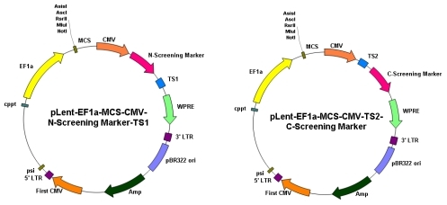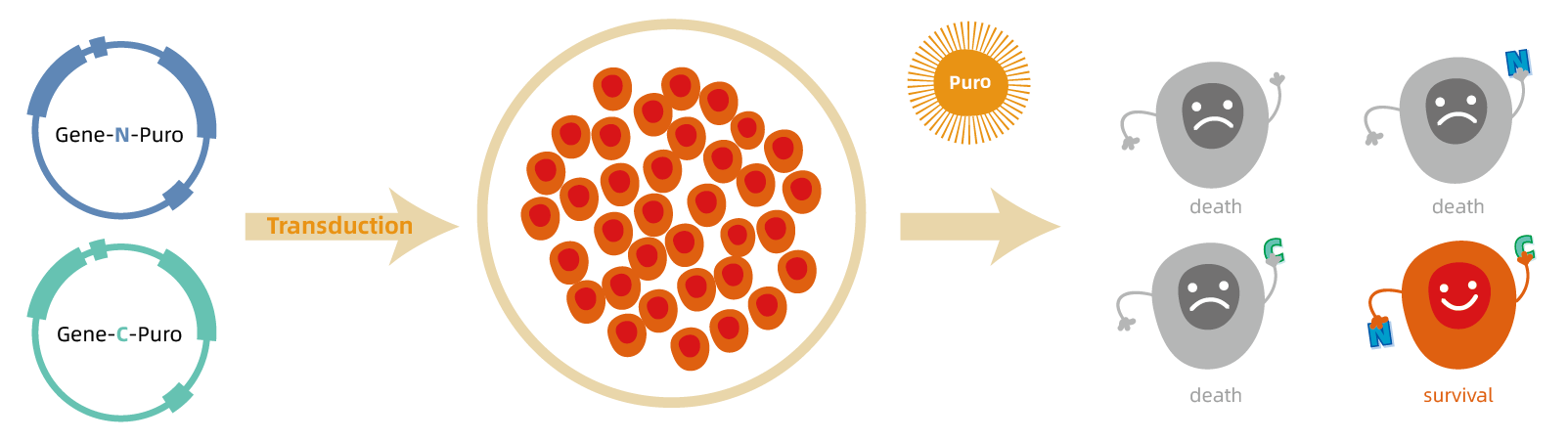 將一種篩選標記分成N端和C端兩部分,分別連接內含子剪接接頭TS1和TS2,構建到兩個慢病毒載體中,然后將兩個載體進行細胞轉導,部分細胞在此過程中“一無所獲”,部分細胞會“攝取”其中一種載體,部分細胞會“攝取”兩種載體。只有當含有N端和C端篩選標記的兩個載體同時被一個細胞“攝取”時,在mRNA水平N-篩選標記和C-篩選標記才會連接成一個完整的篩選標記,從而表達完整的篩選標記蛋白。而那些沒有“攝取”到載體,或者只“攝取”到一種載體的細胞(即N端和C端篩選標記的兩個載體沒有進入一個細胞),該細胞內由于無法表達一個完整的篩選標記蛋白,從而被淘汰。
