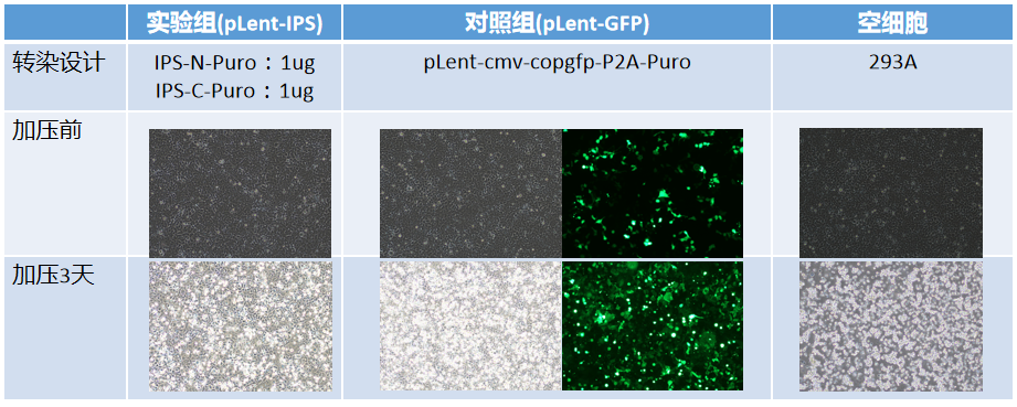 首先,我們將四種轉錄因子分成兩組分別構建到前面所述的雙慢病毒載體中,得到pLent-Ef1a-Oct4-P2A-Sox2-cmv-N-Puro(簡稱IPS-N-Puro)和pLent-Ef1a-Klf4-P2A-Myc-cmv-C-Puro(簡稱IPS-C-Puro)的慢病毒質粒。隨后將這兩個慢病毒質粒共轉到293A細胞中,通過Puro篩選,觀察細胞生長情況。如下圖所示設置實驗組與對照組,我們發現在Puro加壓后空細胞組細胞大量死亡,而實驗組與對照組中細胞存活率較高。這一結果說明,有大量的雙慢病毒載體進入了同一細胞中,抗生素基因得到了正常表達,大量細胞得以存活下來。