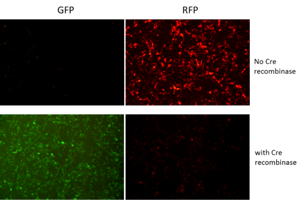 以Cre on shRNA為例,該服務是使用FLEX(flip-excision)系統實現shRNA誘導表達。FLEX是一種非常強大的控制基因表達的方法,它采用2對異質、反向的loxp位點(loxP和lox2272),經過DNA翻轉產生帶有不同loxp位點的DNA翻轉,防止進一步的DNA翻轉,實現目標基因不可逆的翻轉。維真生物采用改良版FLEX,將2對異質、反向的loxp位點置于啟動子兩邊,通過cre作用決定啟動子方向,通過不同熒光蛋白可視化shRNA的表達。
