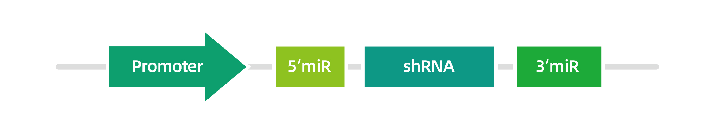 shRNA的RNAi機制與microRNA成熟機制一樣,因此,shRNA也可以由聚合酶II型啟動子驅動表達。這類啟動子包括廣譜啟動子(如CMV、CAG和EF1a等)和組織特異性啟動子(如hSyn、TBG和cTnT等),可以啟動較大的基因轉錄,且需要polyA等轉錄終止信號。維真生物可以根據客戶指定的啟動子和提供的shRNA序列將其構建至mir30-based shRNA質粒。mir30-based shRNA結構示意圖如下: