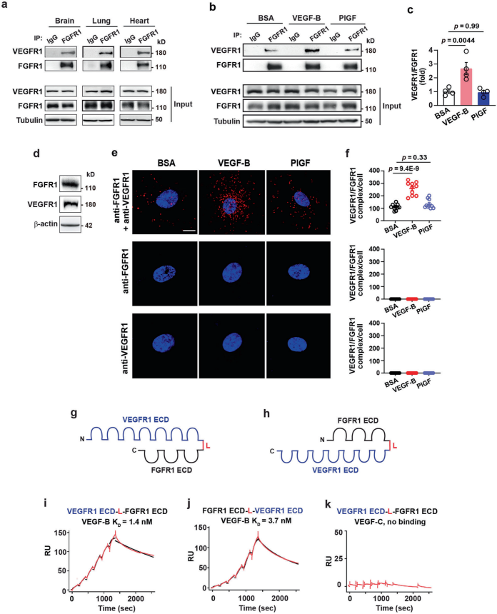 鑒于VEGF-B與VEGFR1和(he)FGFR1結合(he),作者探(tan)討了VEGF-B是(shi)否可(ke)以誘導VEGFR1/FGFR1復合(he)物(wu)的(de)(de)形成(cheng)。IP和(he)WB結果顯示,VEGFR1與FGFR1在(zai)小鼠(shu)腦、肺、心臟等組織(zhi)中共免(mian)疫沉淀,證明存在(zai)天然(ran)的(de)(de)內(nei)源(yuan)性(xing)VEGFR1/FGFR1復合(he)物(wu)。重要的(de)(de)是(shi),在(zai)小鼠(shu)眼睛玻璃體(ti)內(nei)注射VEGF-B會(hui)增加視網膜中VEGFR1/FGFR1復合(he)物(wu)的(de)(de)數量,而(er)(er)用(yong)(yong)胎盤生長因子(PlGF)處理則(ze)沒有(you)(you)。為了直接(jie)觀察FGFR1/VEGFR1復合(he)物(wu),作者使用(yong)(yong)同(tong)時表達VEGFR1和(he)FGFR1的(de)(de)HRECs進(jin)行了原位(wei)近距(ju)離連接(jie)實(shi)驗,發(fa)現VEGF-B處理增加了FGFR1與VEGFR1的(de)(de)關聯(lian),而(er)(er)PlGF沒有(you)(you),表明VEGF-B的(de)(de)作用(yong)(yong)是(shi)特(te)異性(xing)的(de)(de)。體(ti)內(nei)和(he)體(ti)外(wai)實(shi)驗表明,VEGF-B誘導FGFR1/VEGFR1復合(he)物(wu)的(de)(de)形成(cheng)。此(ci)外(wai),VEGF-B以高親和(he)力結合(he)VEGFR1/FGFR1異源(yuan)二聚體(ti)。
