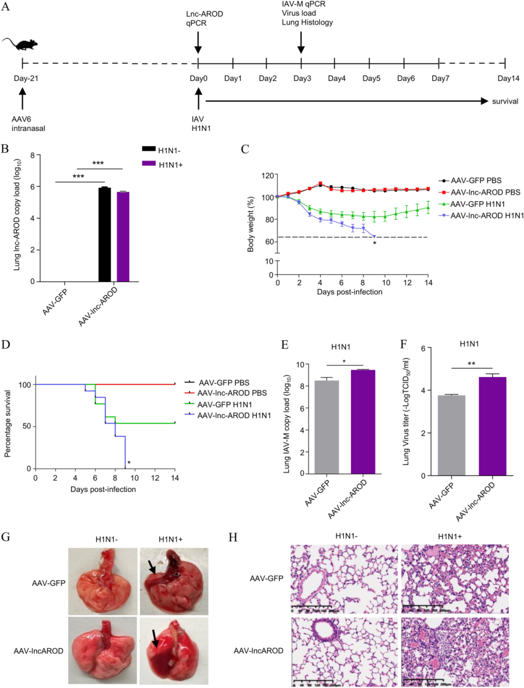圖2. lnc-AROD增加甲型流感病毒的體內毒力