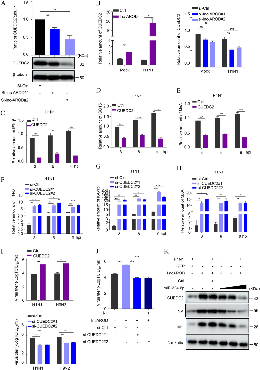 圖3. lnc-AROD通過miR-324-5p-CUEDC2軸促進IAV復制