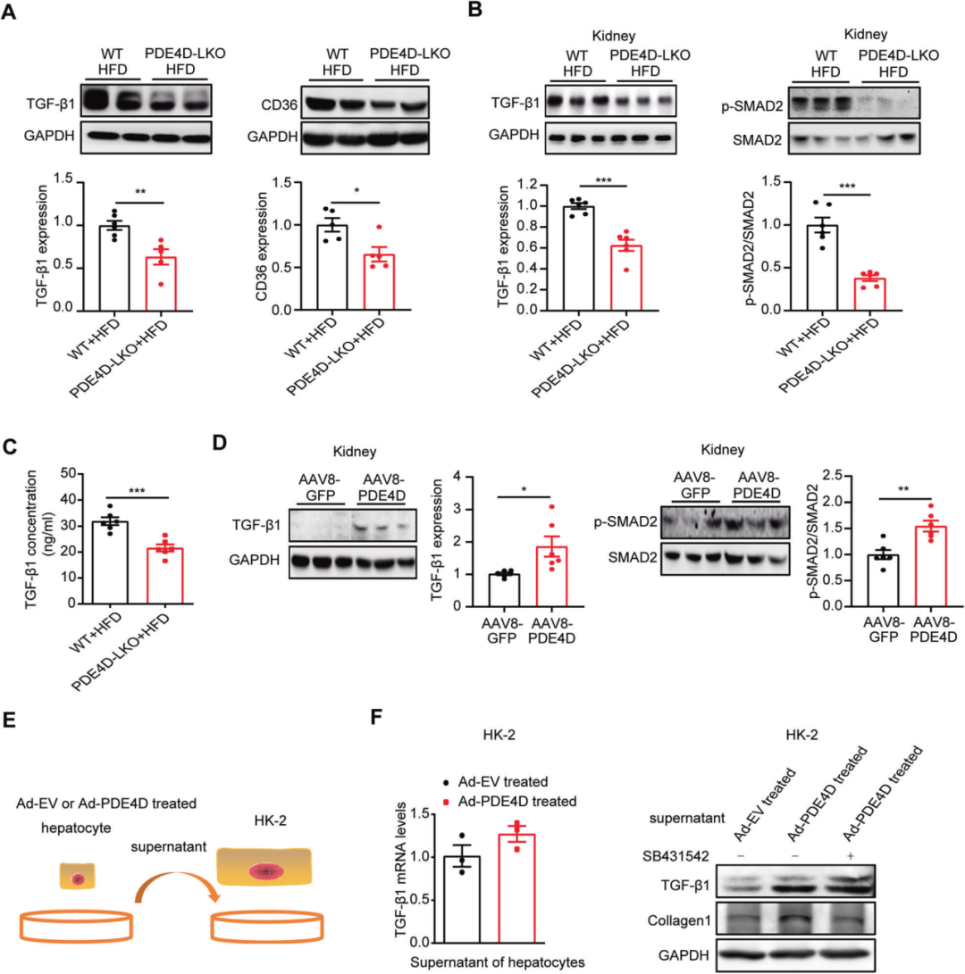 大量研究表明,TGF-β是CKD中驅動纖維化的主要因素,其通過激活Smad依賴性和Smad非依賴性信號通路起作用。作者前期的研究表明PDE4D過表達足以通過CD36-TGF-β1通路觸發NAFLD,在此研究人員發現肝臟PDE4D基因缺失確實導致TGF-β1和CD36蛋白水平下降,并顯著降低HFD喂養小鼠腎臟中TGF-β1的表達、SMAD2的磷酸化以及血清中循環TGF-β1的水平;相反,AAV8-PDE4D處理小鼠腎臟中TGF-β1和p-SMAD2蛋白水平顯著升高。體外用感染Ad-PDE4D或Ad-EV的肝細胞上清液處理HK-2細胞,同樣得到了類似的結果。表明,TGF-β1可能在肝臟PDE4D介導的NAFLD和相關CKD中發揮重要作用。