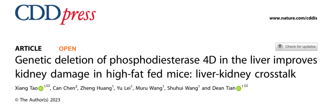 越來越多的流行病學證據表明,非酒精性脂肪性肝病(NAFLD)是慢性腎臟疾病(CKD)的獨立危險因素,但NAFLD與CKD之間的調節機制尚不清楚。2023年,華中科技大學同濟醫學院附屬同濟醫院田德安/項濤教授在Cell Death & Disease (IF 9.685)上發表題為“Genetic deletion of phosphodiesterase 4D in the liver improves kidney damage in high-fat fed mice: liver-kidney crosstalk”的研究論文。該研究指出脂肪肝高表達的PDE4D通過TGF-β1-SMAD信號介導腎損傷,揭示PDE4D可能是NAFLD和相關腎損傷之間的關鍵介質,同時證明PDE4抑制劑羅氟司特是NAFLD相關CKD的潛在治療策略。