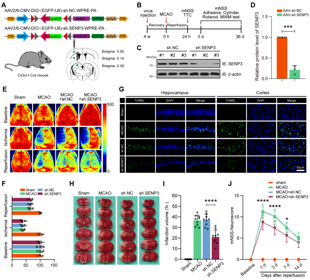 最后,作者檢測了體內SENP3基因沉默對缺血性腦卒中的保護作用。利用AAV2/6干擾載體特異性敲低Cx3cr1-Cre小鼠小膠質細胞中的SENP3,結果顯示SENP3敲低顯著降低了腦I/R損傷海馬和大腦皮層的凋亡細胞數量,明顯減少腦缺血后腦梗死體積,并減輕神經功能缺陷。行為學測試進一步證明SENP3干擾治療可恢復腦缺血導致的神經功能障礙,改善認知,有效保護缺血性梗死。圖3. 小膠質SENP3缺失可減輕缺血誘導的神經元凋亡,改善神經功能
