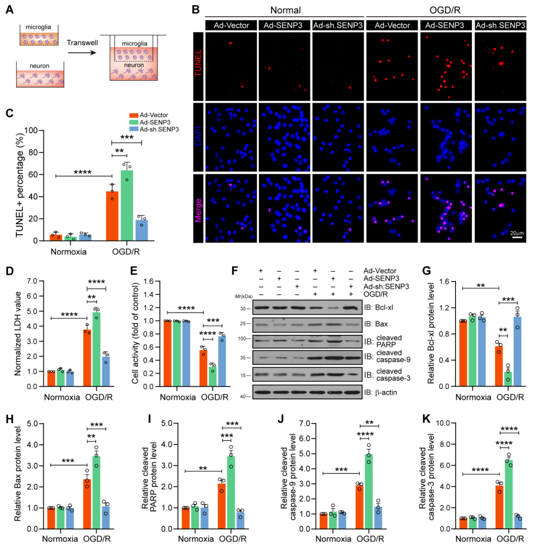 3、小膠質細胞SENP3缺失可減輕缺血誘導的神經元凋亡,改善神經功能