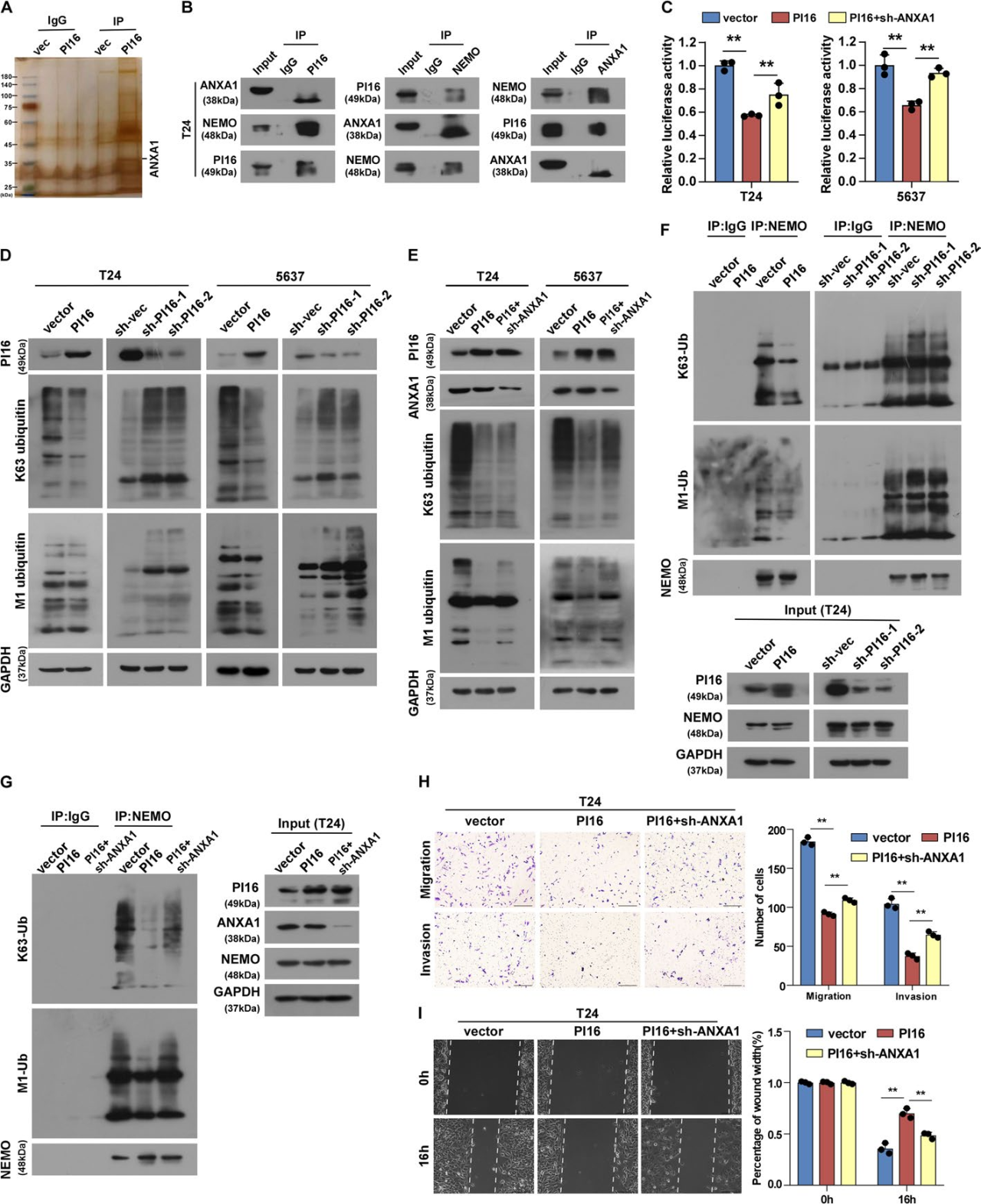 作者研究發現過表達PI16可以抑制NF-κB信號傳導,而敲低PI16激活NF-κB信號傳導。共免疫沉淀(co-IP)和質譜分析鑒定出ANXA1是與PI16相互作用的蛋白,ANXA1敲低可減弱PI16介導的NF-κB抑制,但ANXA1和NEMO蛋白水平不隨PI16的表達而改變。據報道,沉默ANXA1可以阻止NEMO與RIP1之間的相互作用,進而抑制NF-κB的激活。作者研究發現PI16與NEMO相互作用,NEMO識別K63和M1連接的多泛素化,這對于激活NF-κB信號傳導至關重要。K63-Ub和M1-Ub隨著PI16過表達而減少,但隨著PI16敲低而增加,而ANXA1敲低挽救了這種減少。Co-IPs顯示過表達PI16降低NEMO K63-Ub和M1-Ub,ANXA1敲低補充NEMO K63-Ub和M1-Ub。此外,下調ANXA1可減輕PI16過表達導致的運動性和侵襲性降低。綜上,PI16通過依賴ANXA1的NEMO多位點泛素化抑制NF-κB信號傳導。