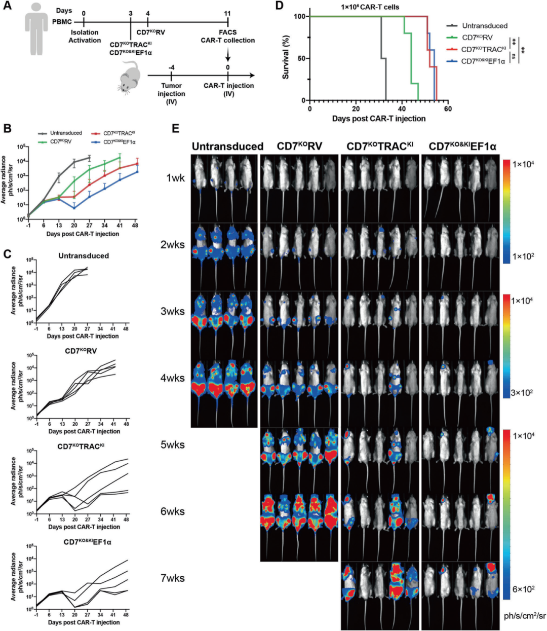 圖2. 小鼠異種移植模型中,CD7KO CAR-T細胞抑制T-ALL的進展