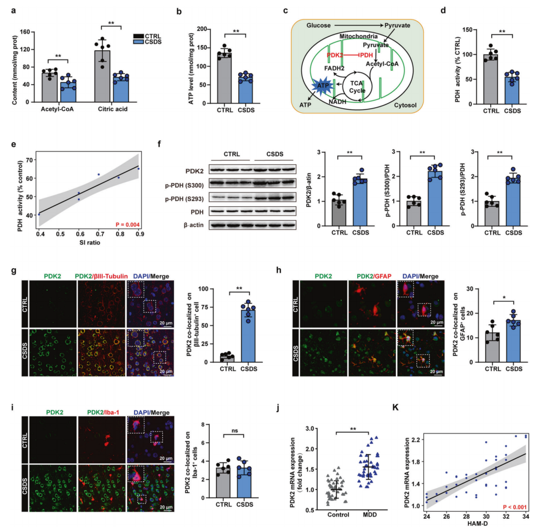 作者發現抑郁癥動物模型CSDS小鼠的能量代謝被干擾。鑒于PDH是丙酮酸進入TCA循環后氧化的關鍵調控因子,作者檢測了PDH活性,發現CSDS小鼠皮層中PDH酶活性顯著降低,且與SI比值呈正相關。進一步檢測發現CSDS小鼠額葉皮層、海馬和下丘腦中PDK2 mRNA水平顯著高于對照組,且僅在皮層中PDK2 mRNA水平與SI比值呈顯著負相關。Western blotting結果顯示CSDS小鼠額葉皮層的PDK2蛋白水平顯著升高,導致PDH磷酸化水平顯著升高。此外,免疫熒光染色結果顯示PDK2主要表達于神經元和星形膠質細胞中,體外實驗證實了這一點,且CSDS暴露更明顯地誘導神經元中PDK2表達。