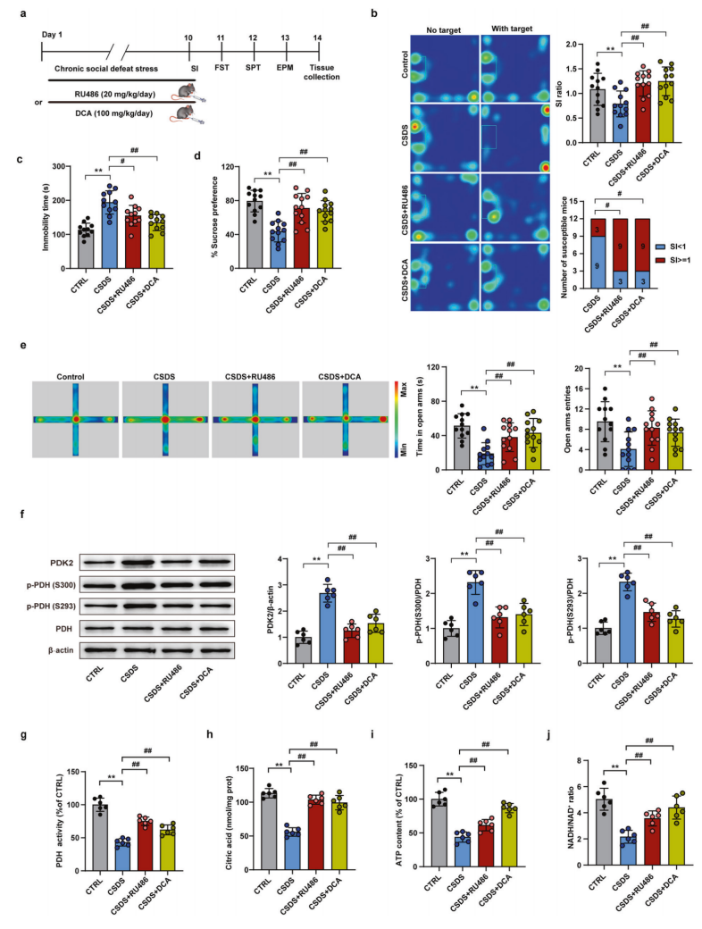 作者發現暴露于CORT會抑制糖酵解途徑進入TCA循環的碳通量,導致神經元功能所需能量供應不足;相反,PDK2耗竭對葡萄糖通量進入TCA循環有顯著的促進作用。為評估GR-PDK2-PDH軸是否影響CSDS小鼠的行為,對CSDS小鼠進行每天腹腔注射RU486或DCA (PDK抑制劑) 1次處理,連續10天。SPT、FST和EPM測試發現,RU486或DCA可以挽救CSDS誘導的抑郁樣行為。此外,CSDS增加了PDK2和p-PDH水平,而RU486或DCA治療顯著逆轉了這些作用。RU486或DCA處理的神經元形態學異常得到改善,CSDS組大鼠皮層神經元凋亡細胞數量明顯高于對照組; 然而,RU486或DCA治療逆轉了這種效果。