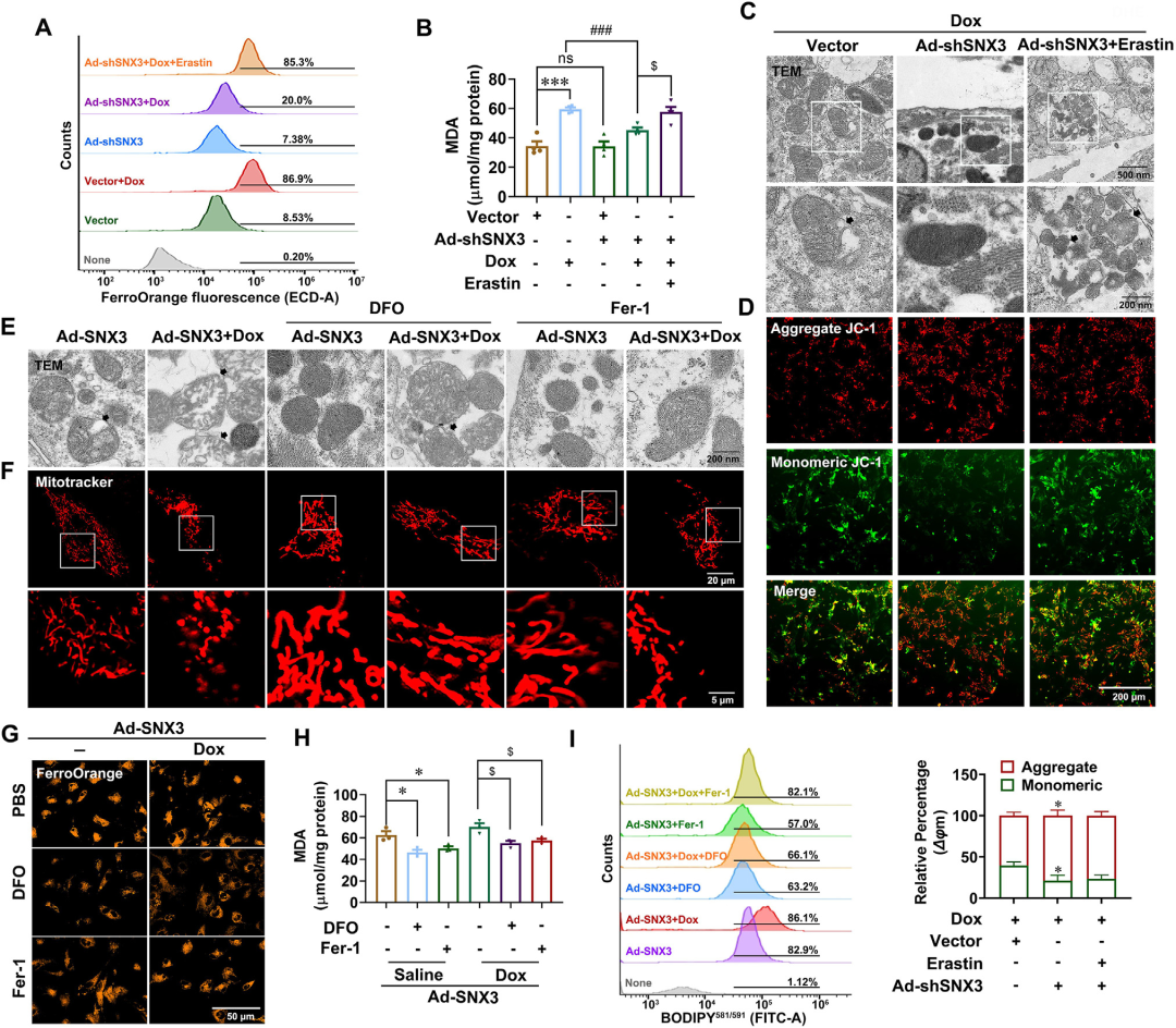 接下來,研究人員進行了體外實驗,進一步證實SNX3在dox誘導心肌病進展中的作用。在Dox治療前,使用Ad-SNX3及Ad-shSNX3(維真助力)感染NRCMs,成功實現了SNX3的過表達及敲低,檢測結果顯示SNX3過表達增強了細胞內脂質過氧化和總ROS水平,導致NRCM中FerroOrange熒光強度顯著增加以及線粒體萎縮和破裂,然而,SNX3缺失減輕了這些效應。值得注意的是,Ad-shSNX3對dox處理的NRCM中鐵死亡的保護作用被鐵死亡激活劑erastin消除,而Ad-SNX3造成NRCMs中線粒體形態損傷、Fe2+和脂質過氧化產物增強,在很大程度上被鐵死亡抑制劑逆轉。上述數據表明SNX3通過誘導鐵死亡加重dox誘導的心肌病。