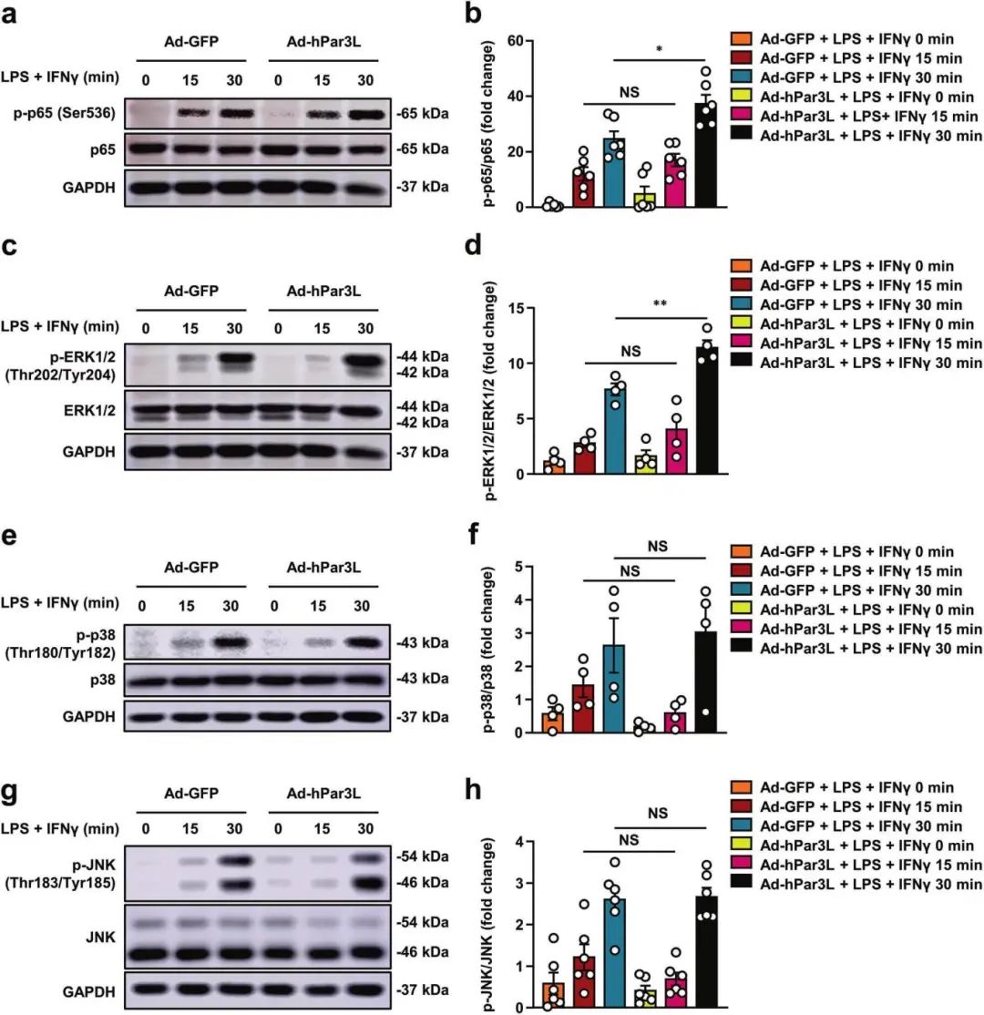 研究報道NF-κB p65亞基的激活通過TLR配體調節M1巨噬細胞極化,產生促炎因子,1,2 -乙二胺SQ109通過p38 MAPK途徑促進M1巨噬細胞極化。鑒于NF-κB和MAPK在M1巨噬細胞極化中的關鍵作用,作者試圖確定Par3L是否影響這些途徑。結果顯示,在LPS和IFNγ處理的腹腔巨噬細胞(PMs)中,Par3L過表達增加了p-p65和p-ERK1/2,而在感染Ad-GFP或Ad-hPar3L的PMs中,p-p38和p-JNK沒有明顯變化。綜上所述,這些數據表明Par3L過表達通過激活p65和ERK信號誘導M1巨噬細胞極化。進一步驗證表明阻斷NF-κB和ERK信號通路可消除Par3L對M1巨噬細胞極化的影響。
