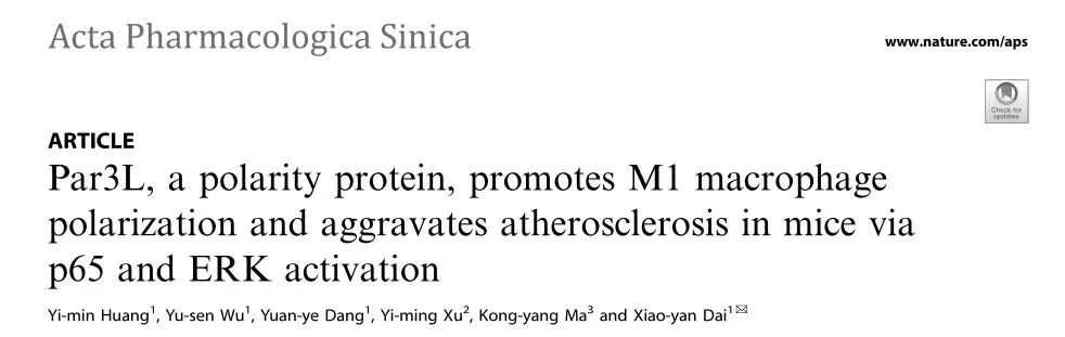 2023年9月,廣州醫科大學代小艷教授團隊在Acta Pharmacologica Sinica(IF8.2)發表題為“Par3L, a polarity protein, promotes M1 macrophage polarization and aggravates atherosclerosis in mice via p65 and ERK activation”的文章。研究闡明了Par3L促進M1巨噬細胞極化并加重動脈粥樣硬化的作用,揭示Par3L可能是動脈粥樣硬化的潛在治療靶點。