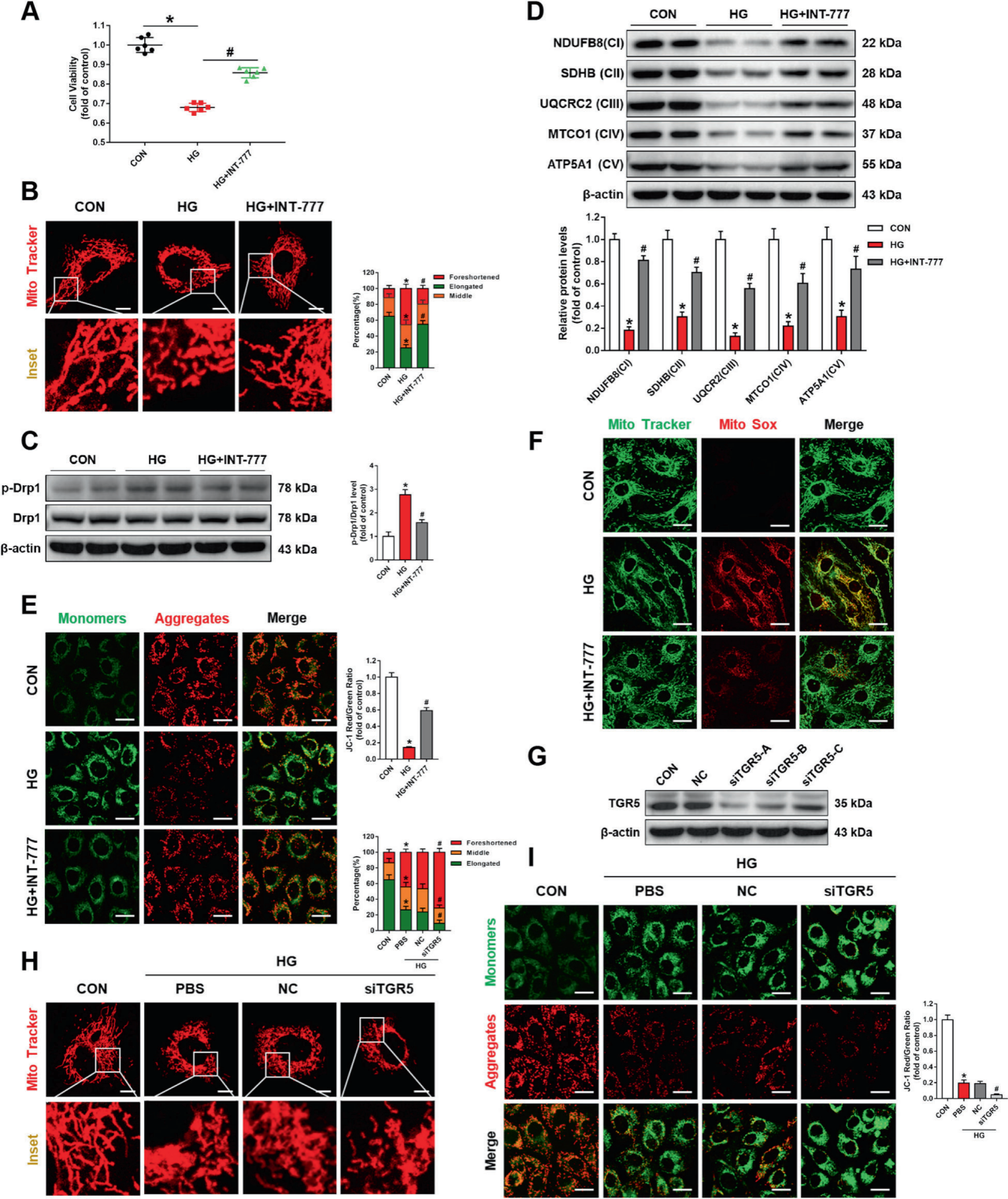 神經膠質細胞(Müller glial cells)遍布視網膜,發揮維持視網膜穩態和完整性的功能。免疫熒光染色結果提示TGR5在Müller細胞中表達,TGR5激動劑INT-777顯著地挽救了高糖(HG)誘導的細胞活力下降。Müller細胞線粒體形態研究發現HG處理的細胞中線粒體分裂成短球體,INT-777顯著恢復線粒體形態,進一步研究發現TGR5可能通過PKCδ-Drp1途徑調節線粒體裂變。此外,INT-777上調線粒體呼吸鏈復合物如NDUFB8、SDHB、UQCRC2、MTCO1和ATP5A1的表達,且明顯減輕隨HG刺激而降低的MMP,表明TGR5激活改善了線粒體功能。通過轉染TGR5特異性siRNA,發現TGR5的下調加重了HG誘導的線粒體斷裂;同時,TGR5的下調導致MMP的降低。以上結果表明TGR5是介導線粒體功能的關鍵因素。