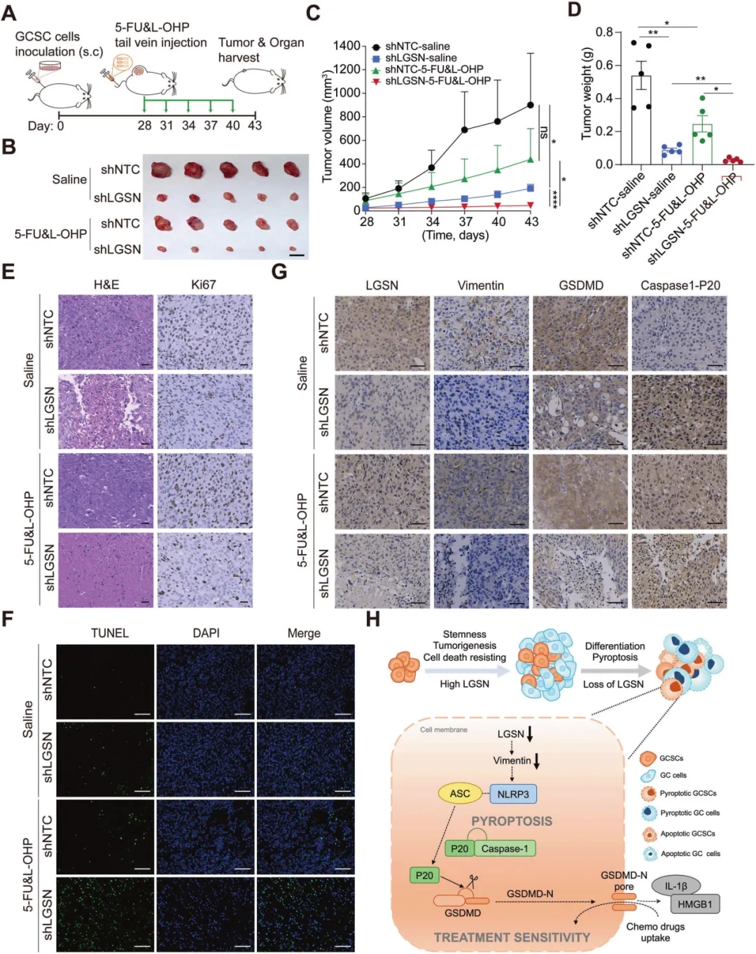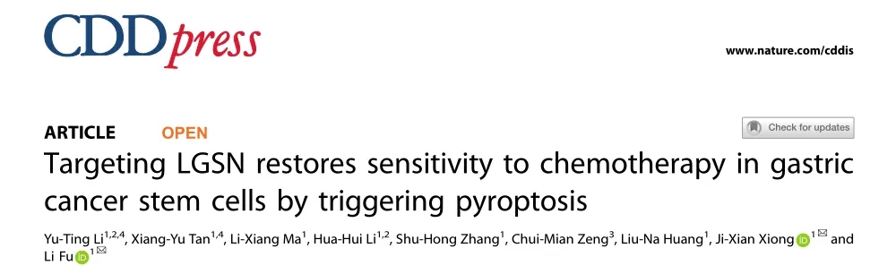 2023年8月,深圳大學醫學部付利/熊繼先研究團隊在Cell Death & Disease?(IF?9.0)發表題為“Targeting LGSN restores sensitivity to chemotherapy in gastric cancer stem cells by triggering pyroptosis”的文章。研究發現 LGSN與GC患者的惡性進展和不良預后高度相關,靶向LGSN通過引發胃癌干細胞焦亡恢復對化療的敏感性,研究結果為胃癌治療提供了一種新的有效策略。