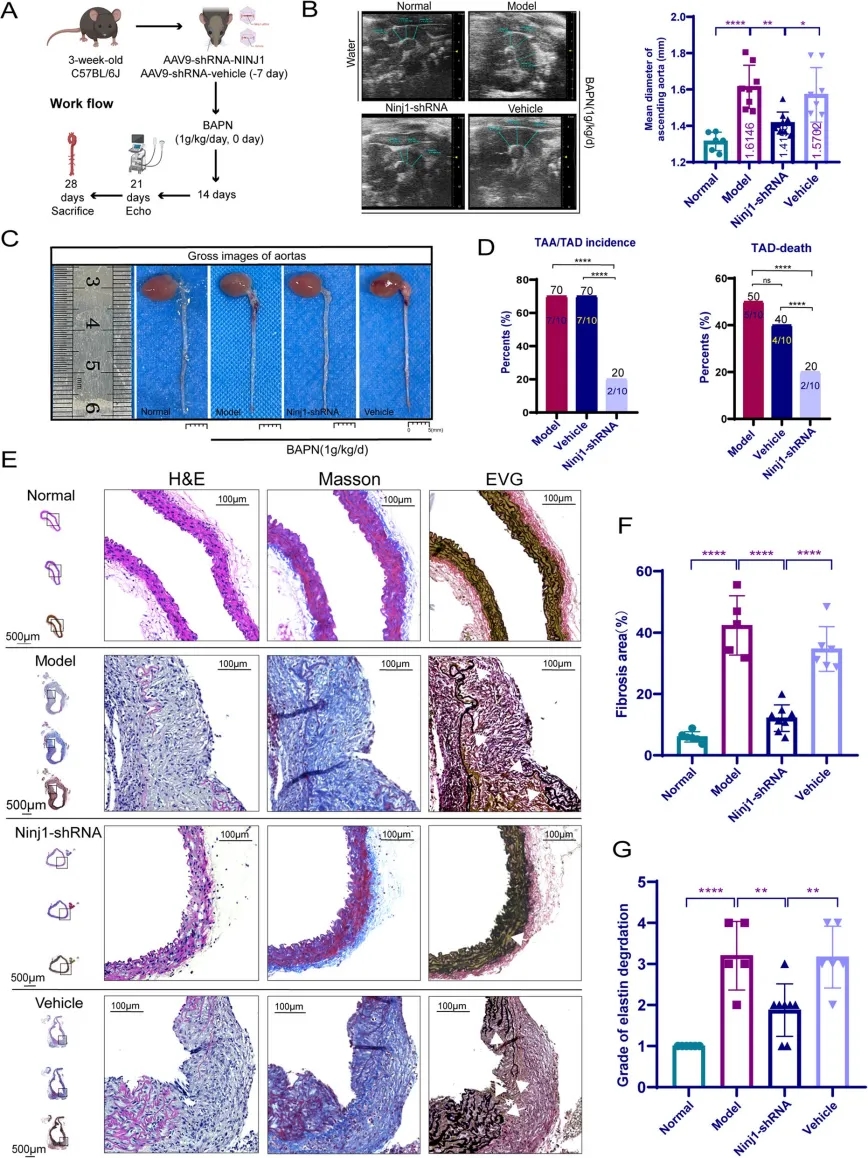 為進一(yi)步(bu)說明NINJ1和(he)TAD之間的(de)(de)關系,作(zuo)(zuo)者將(jiang)AAV9-shNinj1或AAV9-NC注入3周(zhou)齡雄性(xing)C57BL/6J小鼠(shu)眶后靜(jing)脈,并在(zai)(zai)AAV9注射后第7天,構建了BAPN誘導的(de)(de)TAD小鼠(shu)模型(xing)。檢(jian)測結果(guo)(guo)表明,Ninj1-shRNA可(ke)顯著(zhu)降(jiang)低胸主(zhu)動脈平均直(zhi)徑、TAA/TAD發生率(lv)及死亡率(lv);染色結果(guo)(guo)顯示,Ninj1-shRNA顯著(zhu)降(jiang)低TAD模型(xing)主(zhu)動脈壁的(de)(de)纖維化水(shui)平、彈(dan)性(xing)纖維斷裂和(he)變性(xing)。不(bu)僅如此(ci),Ninj1-shRNA還明顯減輕了T細(xi)胞和(he)巨噬細(xi)胞在(zai)(zai)主(zhu)動脈內的(de)(de)浸潤,減少T細(xi)胞和(he)CD31+α-SMA+數量(liang)。以上結果(guo)(guo)提示,敲低NINJ1可(ke)能在(zai)(zai)TAD中炎癥(zheng)浸潤、細(xi)胞死亡和(he)EndMT相(xiang)關的(de)(de)血管重(zhong)構中發揮(hui)重(zhong)要(yao)抑(yi)制作(zuo)(zuo)用。