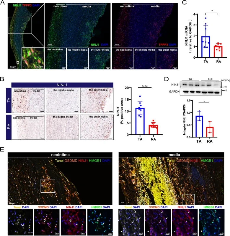 作者(zhe)利用具有空間分(fen)(fen)辨率(lv)的(de)(de)(de)全基(ji)因(yin)組轉錄譜分(fen)(fen)析(xi)技(ji)術,獲得了從(cong)撕裂(lie)區域(tear area,TA)到遠端區域(remote area,RA)的(de)(de)(de)基(ji)因(yin)表(biao)達(da)特征(zheng),發(fa)現從(cong)TA到RA有四(si)種不同的(de)(de)(de)基(ji)因(yin)表(biao)達(da)模式,分(fen)(fen)別是炎(yan)癥、膠原分(fen)(fen)解、細胞(bao)(bao)外基(ji)質(zhi)重塑和(he)細胞(bao)(bao)應激(ji)。免(mian)疫(yi)染色顯示集群I中排(pai)名(ming)靠前的(de)(de)(de)基(ji)因(yin)NINJ1和(he)TPPP3在(zai)TAD組織(zhi)中共(gong)表(biao)達(da),二者(zhe)在(zai)TA中的(de)(de)(de)表(biao)達(da)強度明(ming)顯高于RA,進一步通過qPCR和(he)WB對NINJ1的(de)(de)(de)表(biao)達(da)進行(xing)了表(biao)征(zheng),結果(guo)表(biao)明(ming)NINJ1在(zai)TA中的(de)(de)(de)轉錄及(ji)蛋(dan)白水平(ping)均(jun)有高表(biao)達(da)。多標記免(mian)疫(yi)熒光顯示,在(zai)新(xin)生內(nei)膜和(he)外周無組織(zhi)內(nei)層中,NINJ1與細胞(bao)(bao)死亡(wang)標記物以(yi)及(ji)促炎(yan)標記物共(gong)定(ding)位,提(ti)示NINJ1可能是TAD形成的(de)(de)(de)新(xin)參(can)與者(zhe)。進一步分(fen)(fen)析(xi)發(fa)現NINJ1主要在(zai)TAD主動脈的(de)(de)(de)巨(ju)噬細胞(bao)(bao)、T細胞(bao)(bao)和(he)CD31+ α-SMA+雙陽性(xing)細胞(bao)(bao)中表(biao)達(da),表(biao)明(ming)NINJ1與TAD的(de)(de)(de)炎(yan)癥、內(nei)膜和(he)介質(zhi)重塑有關。