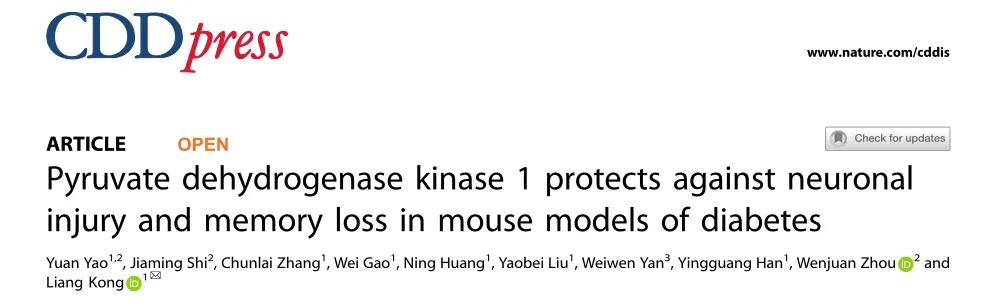 高血糖引起的糖代謝異常是糖尿病(DM)患者神經變性和認知功能障礙的一個致病因素。丙酮酸脫氫酶激酶(PDK)-乳酸軸被認為是代謝重編程與神經系統疾病發病過程之間的關鍵環節。然而,其在糖尿病性神經病變中的作用尚不清楚。2023年11月7日,山東中醫藥大學附屬醫院孔亮團隊在Cell Death & Disease?(IF?9.0) 發表題為“Pyruvate dehydrogenase kinase 1 protects against neuronal injury and memory loss in mouse models of diabetes”的研究論文。文章探討了PDK1在高血糖誘導的異常代謝和神經元損傷中的作用和機制,乙酰輔酶A誘導的組蛋白乙酰化和HIF-1調控PDK1的表達,增強PDK1可能對糖尿病小鼠的認知恢復有保護作用。