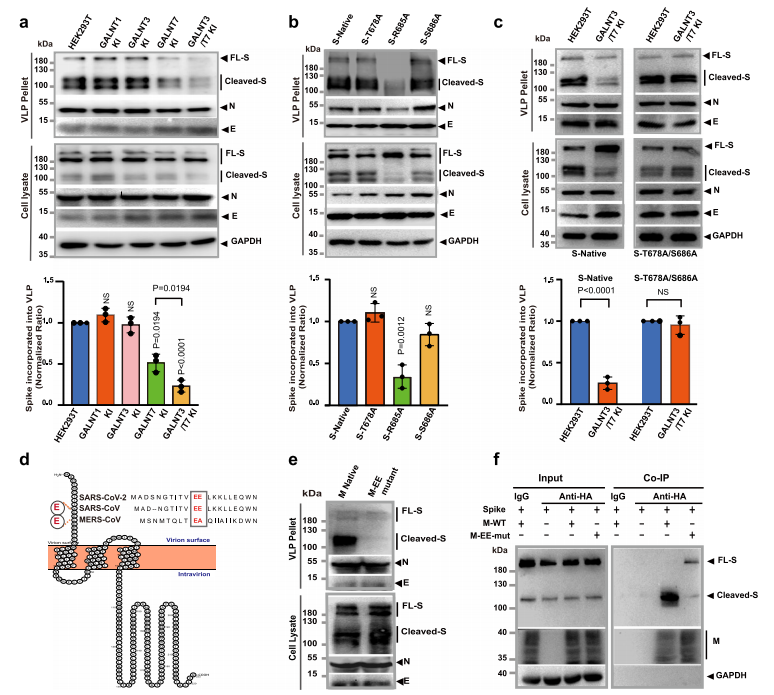由于參與O-糖基化途徑的大多數酶位于高爾基體中,冠狀病毒在ER-高爾基中間室(ERGIC)中組裝,因此作者探究了GalNAc-T3和T7糖基化活性對組裝的病毒樣顆粒中刺突蛋白Furin切割的潛在影響。在具有或不具有GALNT3和/或GALNT7 KI的HEK293T細胞中組裝SARS-CoV-2的病毒樣顆粒(VLPs),發現GALNT3和GALNT7的雙KI導致包裝在VLP顆粒中的刺突蛋白數量減少了大約80%,而刺突蛋白在總細胞裂解物中的表達水平沒有明顯變化。相比之下,GALNT3的單個KI或普遍表達的GALNT1并不顯著影響刺突蛋白在VLP中的組裝,而GALNT7的單個KI也顯著降低刺突蛋白的結合量( 53 % )。盡管在細胞裂解液中存在大量未裂解的刺突蛋白,但整合到VLPs中的刺突蛋白主要被裂解。這一發現表明裂解的刺突蛋白可以更有效地整合到VLP中,Furin加工有助于刺突蛋白組裝到SARS-CoV-2的VLP中。進一步研究發現GalNAc-T3和T7可能通過T678和S686的糖基化抑制刺突蛋白并入VLP。接下來,作者研究了Furin切割依賴的刺突蛋白組裝到SARS CoV-2病毒粒子中的可能機制,發現SARS-CoV-2的M蛋白通過其EE基序與Furin切割時暴露的S1片段富含精氨酸的C端之間的電荷相互作用與裂解的S蛋白特異性相互作用,這種相互作用對于含有刺突蛋白的功能性病毒粒子的組裝是必不可少的。綜上,宿主細胞中表達的GalNAc-T3和T7對Furin切割的調控可能對病毒粒子組裝產生重大影響,從而影響SARS-CoV-2引起的感染。