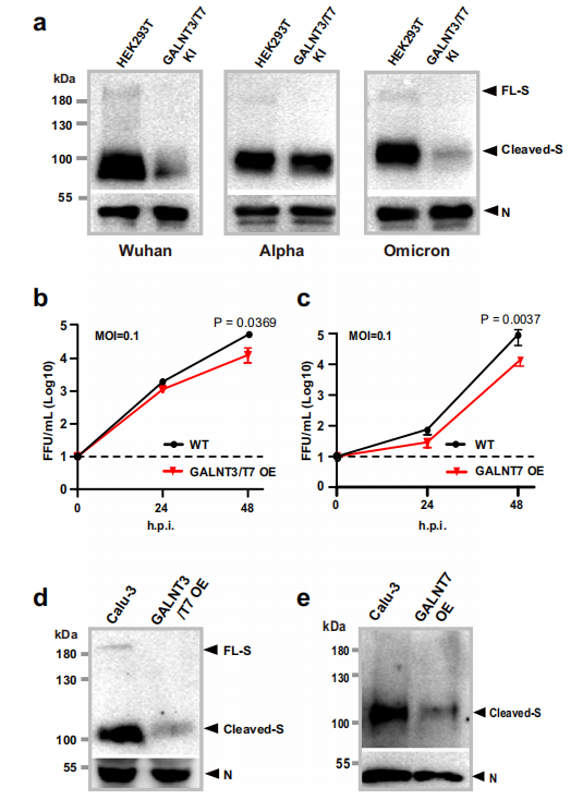 圖4. 在人肺細胞中過表達GalNAc-T3和T7抑制Omicron復制