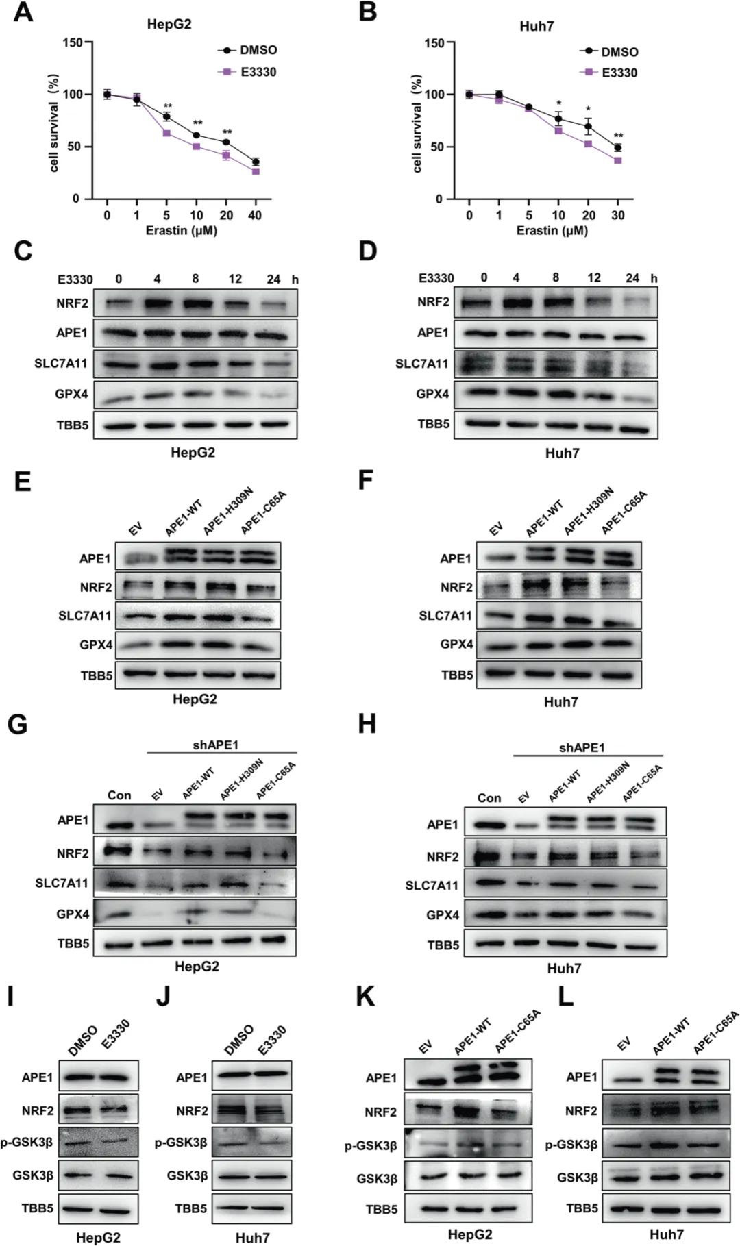 通過在對照或APE1-KD HCC細胞中過表達或敲低NRF2,證實沉默APE1增強的鐵死亡依賴于NRF2。由于APE1同時具有DNA修復功能和氧化還原調節功能,因此需明確具體哪種功能參與鐵死亡的調節,數據顯示敲低APE1或使用CRT(APE1 DNA損傷修復功能抑制劑)增加了HCC細胞中的γ-H2AX(DNA損傷標記物)水平,然而Ferr-1處理不影響APE1敲低細胞或CRT處理的細胞和對照細胞中的γ-H2AX水平,以及DNA損傷反應信號水平;將CRT與erastin、RSL3聯合處理HCC細胞,發現CRT對erastin或RSL3誘導的HCC細胞鐵死亡沒有影響,表明抑制APE1增強的鐵死亡與其DNA修復功能無關。隨后用E3330(APE1 氧化還原功能抑制劑)處理HCC細胞,增強了erastin和RSL3誘導的細胞死亡,同時下調了HCC細胞中SLC7A11和GPX4的mRNA和蛋白水平,以及NRF2的蛋白水平。通過構建APE1的DNA損傷修復功能突變體和氧化還原功能突變體,進一步表明APE1通過其氧化還原功能調節GSK3β的磷酸化,從而影響NRF2的穩定性,并調節參與鐵死亡的SLC7A11和GPX4的表達。