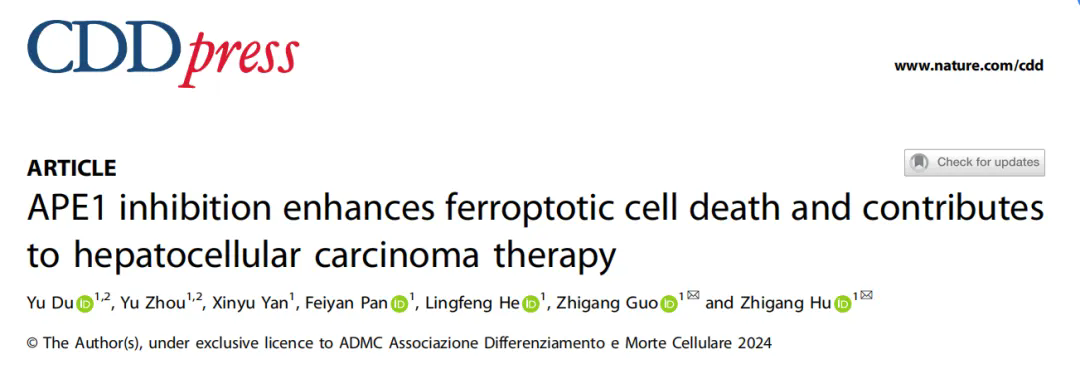 肝細胞癌(HCC)是癌癥相關死亡的主要原因之一,目前的治療措施仍不能有效改善HCC患者的總生存率。鐵死亡是由鐵依賴性脂質過氧化引發的一種細胞死亡形式,已成為一種有前途的癌癥治療策略,尤其是在HCC中。然而,HCC中鐵死亡調節的機制尚不清楚。2024年2月28日,南京師范大學郭志剛/胡志剛教授團隊在Cell Death and Differentiation (IF 12.4)發表題為“APE1 inhibition enhances ferroptotic cell death and contributes to hepatocellular carcinoma therapy”的研究論文。研究揭示了多功能酶APE1在鐵死亡調節中的新作用和機制,并強調了靶向APE1作為HCC和其他癌癥治療策略的潛力。