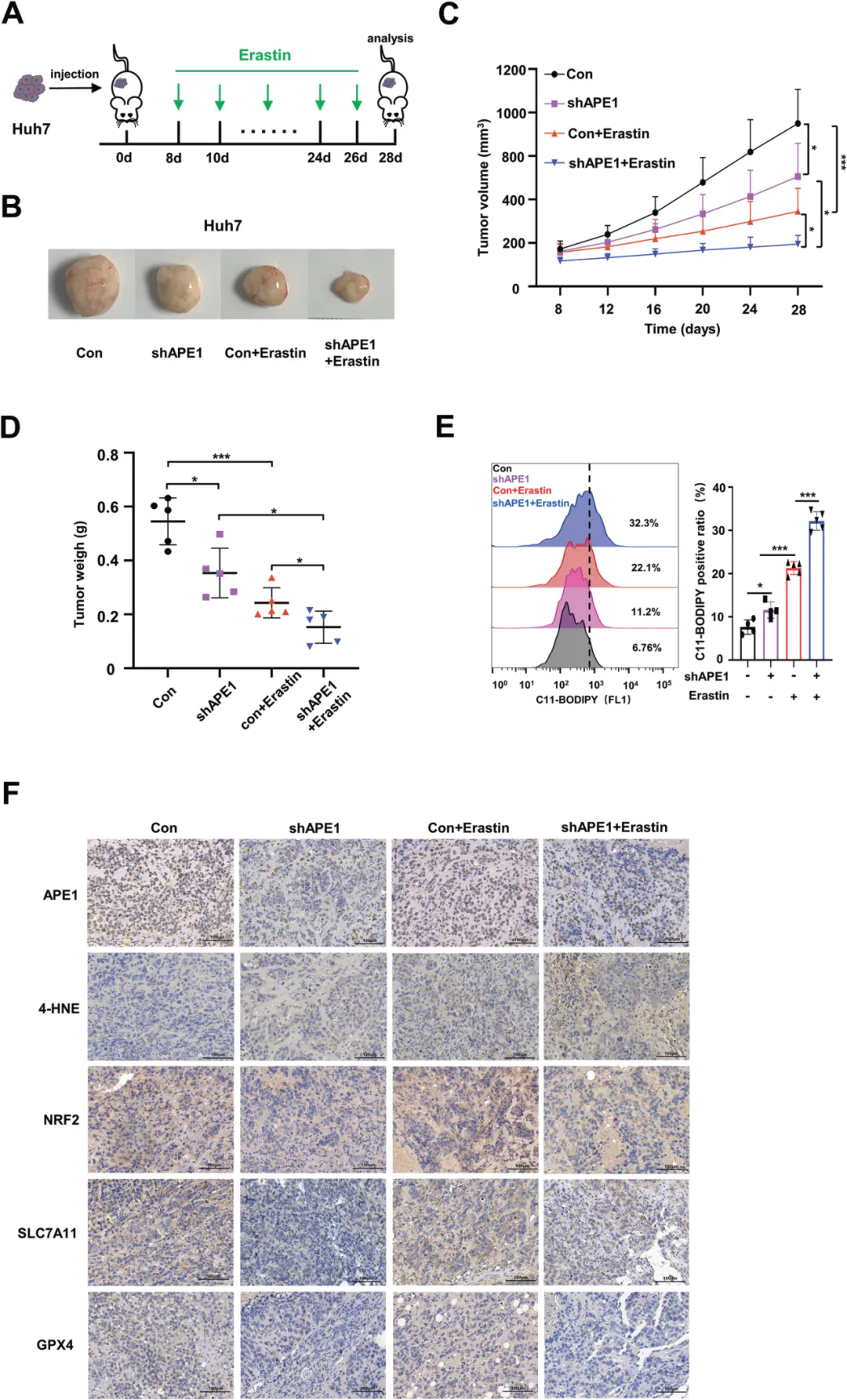 作者在裸鼠中建立了APE1-KD Huh7衍生的異種移植物模型,以進一步研究APE1抑制對體內HCC鐵死亡的影響。與對照組相比,APE1-KD和erastin聯合處理提高了治療效果;通過流式細胞術檢測發現APE1的沉默上調了腫瘤組織中由erastin誘導的脂質過氧化水平。IHC染色和WB實驗表明,erastin處理增加了SLC7A11和CHAC1的蛋白質水平,表明erastin對小鼠的治療是有效的。此外,與野生型Huh7來源的腫瘤組織相比,APE1-KD Huh7細胞來源的腫瘤細胞組織中的NRF2、SLC7A11和GPX4蛋白水平降低,并且APE1的敲低顯著上調了erastin誘導的4-HNE在腫瘤組織中的積累。上述結果表明APE1缺失增強了erastin在體內對HCC的治療作用。