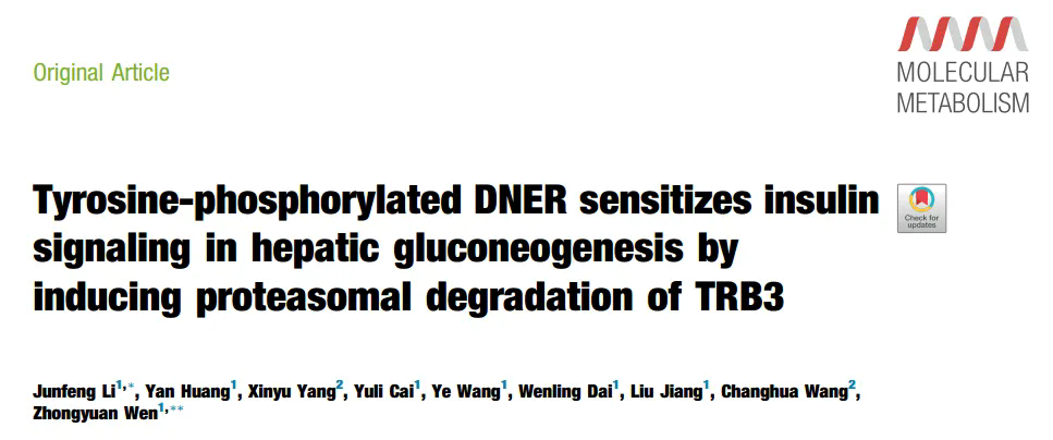肝胰島素抵抗導致肝糖異生增加,是2型糖尿病(T2DM)空腹高血糖的主要原因,然而其潛在的信號機制仍有待探索。Delta/Notch樣表皮生長因子(EGF)相關受體(DNER)最初被描述為神經元特異性Notch配體,最近被確定為T2DM的易感基因,暗示DNER在胰島素信號通路中有潛在的作用。2024年3月27日,武漢大學人民醫院文重遠/李俊峰研究團隊在Molecular Metabolism (IF 8.1)期刊發表題為“Tyrosine-phosphorylated DNER sensitizes insulin signaling in hepatic gluconeogenesis by inducing proteasomal degradation of TRB3”的文章。研究發現DNER通過泛素-蛋白酶體降解途徑抑制內源性Akt抑制劑TRB3,從而增強肝糖異生中的胰島素信號傳導,揭示了DNER在肝糖異生中的作用及其胰島素增敏作用。