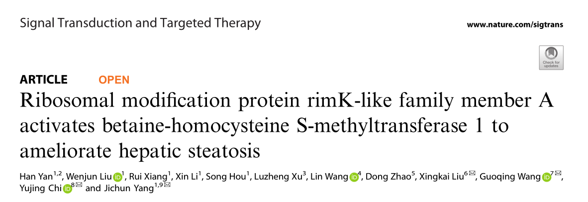 2024年8月8日,北大基礎醫學院楊吉春教授、北大人民醫院遲毓婧副教授聯合吉林大學王國慶教授、吉林大學第一醫院劉興凱教授團隊在Signal Transduction and Targeted Therapy(IF 40.8)上在線發表了題為“Ribosomal modification protein rimK-like family member A activates betaine-homocysteine S-methyltransferase 1 to ameliorate hepatic steatosis”的文章,研究發現RIMKLA是一種新型蛋白激酶,可使BHMT1 Thr45位點磷酸化,從而抑制脂質合成和攝取。在肥胖情況下,抑制RIMKLA會損害BHMT1活性,從而促進肝臟脂質沉積,表明激活肝臟RIMKLA-BHMT1功能復合物可能是治療高同型半胱氨酸血癥和代謝紊亂的新策略。