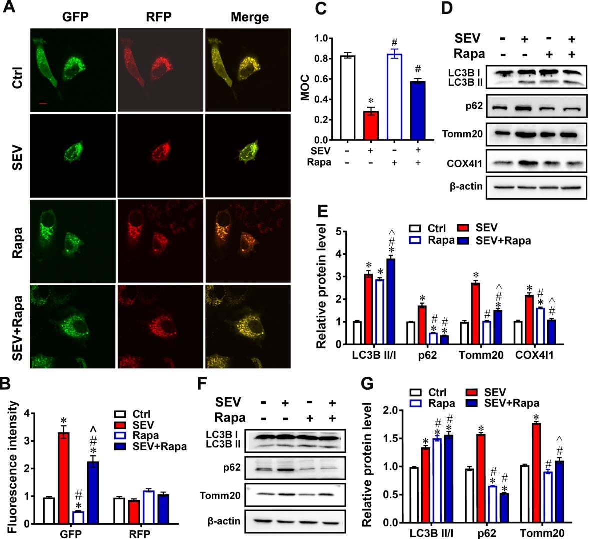 H4細胞中自(zi)噬誘導劑雷帕(pa)霉素(su)的(de)(de)加入(ru)顯(xian)著降低了七氟醚(mi)引起(qi)的(de)(de)胞內(nei)和線(xian)粒體內(nei)ROS水平(ping)的(de)(de)升高,并(bing)改(gai)善(shan)了老年(nian)大鼠海馬線(xian)粒體的(de)(de)形(xing)態。熒(ying)光成像和定(ding)量數(shu)據表明(ming),經雷帕(pa)霉素(su)處(chu)理后,SEV組LAMP1的(de)(de)熒(ying)光強度增強,Tomm20的(de)(de)熒(ying)光強度降低,表明(ming)雷帕(pa)霉素(su)改(gai)善(shan)了七氟醚(mi)引起(qi)的(de)(de)溶酶體及(ji)線(xian)粒體功能(neng)的(de)(de)受損。
