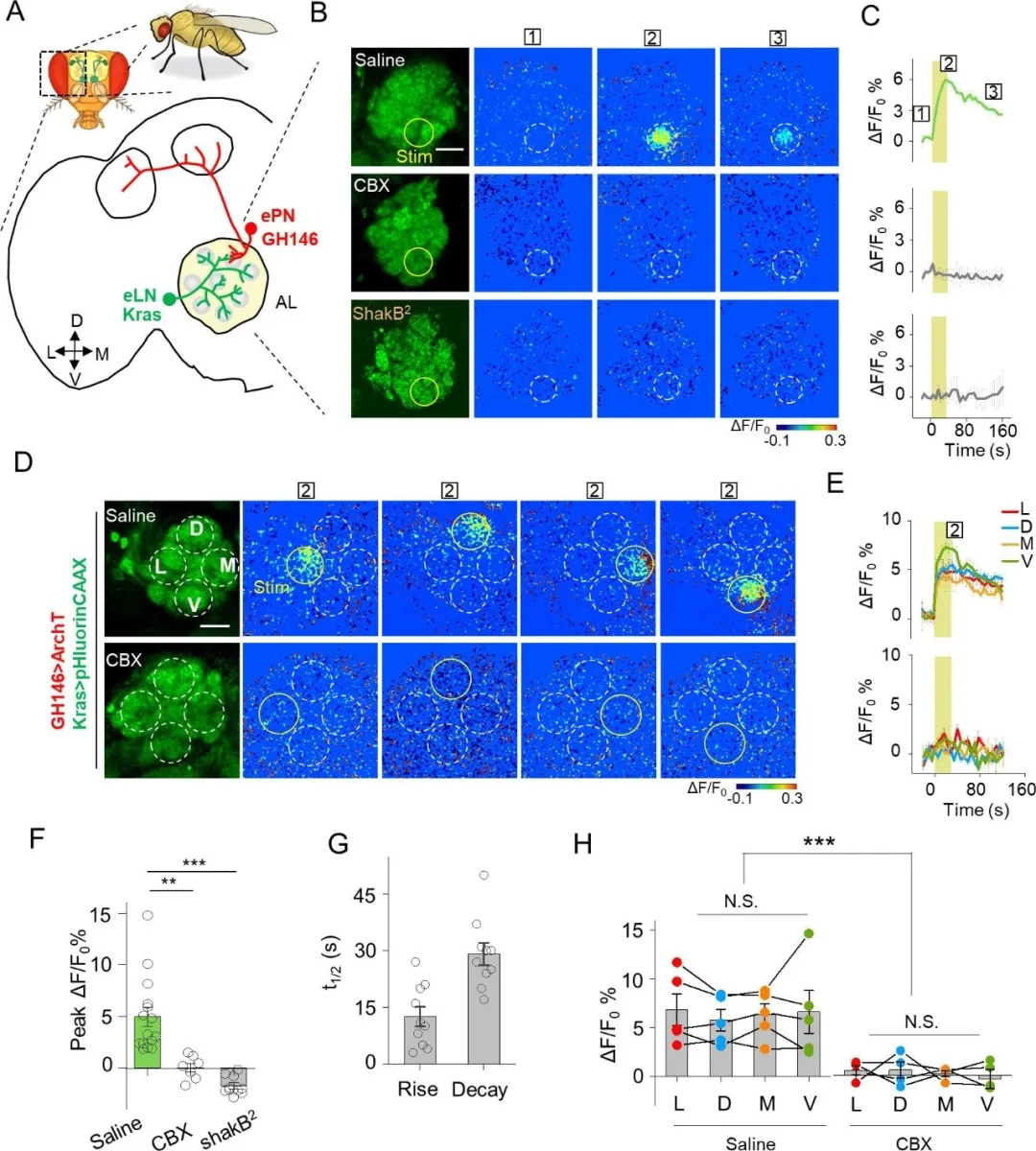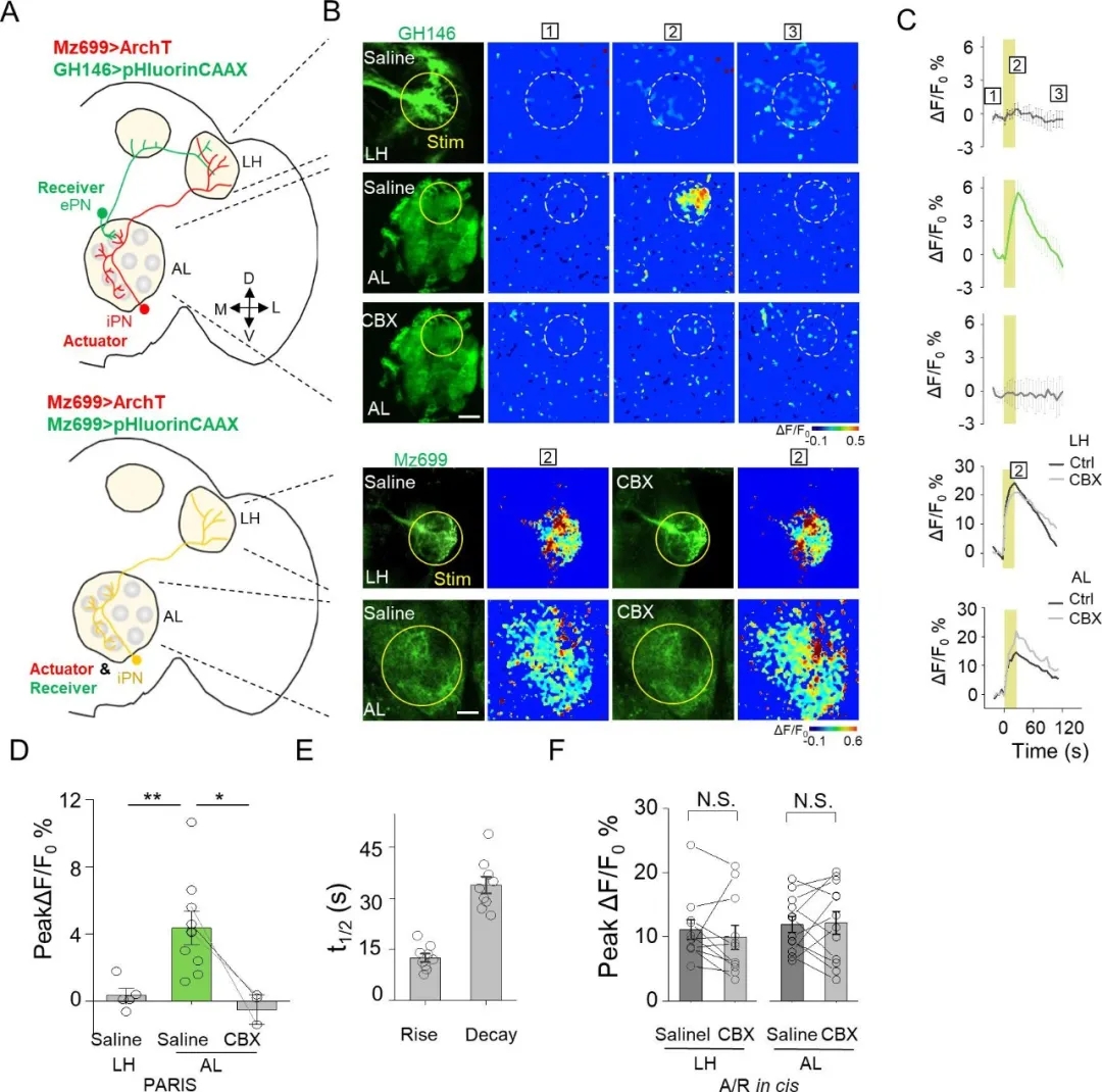 作者在iPNS中表達了光控質子“泵”(Mz699-Gal4 > UAS ArchT),在ePNS中表達了熒光傳感器(GH146-QF > QUAS pHluorinCAAX),然后光刺激AL或LH中ePNS-iPNS重疊的區域,檢測是否存在功能性縫隙連接。結果顯示,光刺激AL,而不是LH,引起了pHluorinCAAX熒光的顯著增加,并且用CBX處理后熒光響應被消除。上述結果表明iPNS和ePNS在AL處通過樹突-樹突接觸形成功能性縫隙連接,而不是在LH中通過軸突-軸突接觸。