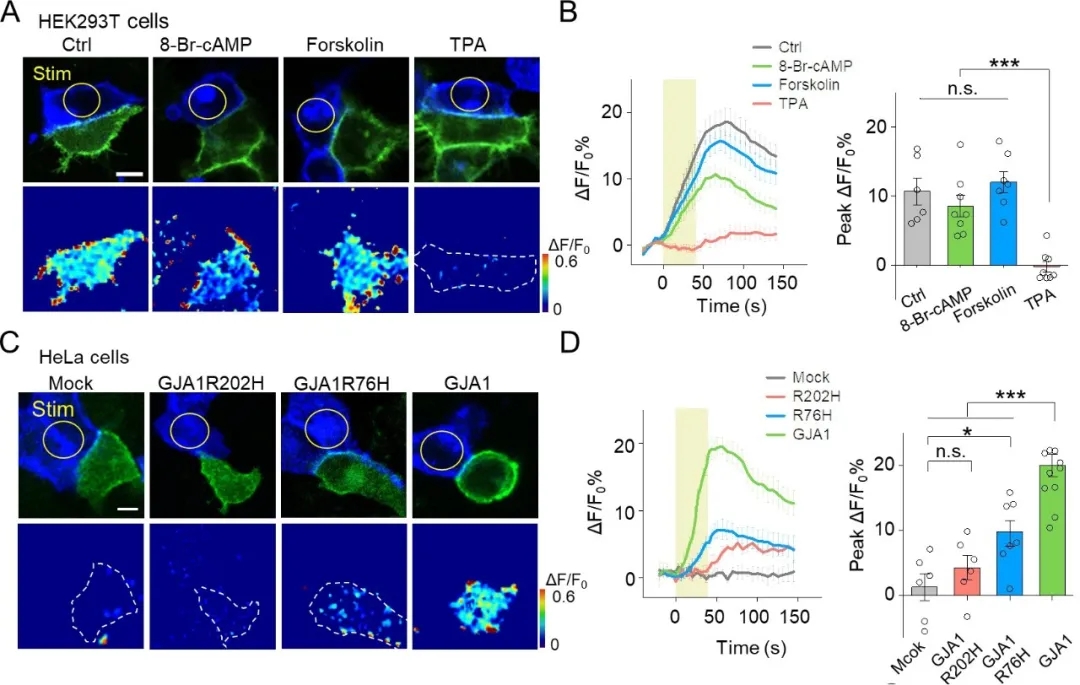 研究表明,磷酸化通過影響縫隙連接的組裝、降解和門控等途徑參與其調節。接下來,作者探討了PARIS是否可以在蛋白磷酸化等調節條件下檢測縫隙連接:用cAMP類似物8-Br-cAMP、腺苷酸環化酶激動劑Forskolin及蛋白激酶C(PKC)激動劑TPA處理表達PARIS的HEK293T細胞。與對照組相比,經TPA處理細胞后,PARIS信號受到顯著抑制,而8-Br-cAMP和Forskolin的處理對其未造成明顯影響,表明PKC的激活會抑制縫隙連接。