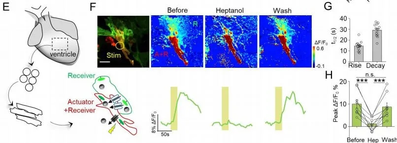 由連接蛋白Cx40、Cx43和Cx45形成的縫隙連接在心肌細胞中起著重要作用,它們的的缺陷與心血管疾病有關。作者用培養的新生大鼠心肌細胞,光刺激“質子泵”心肌細胞,在相鄰接收器心肌細胞中產生了強烈的熒光,并且這種熒光響應可以被縫隙連接阻滯劑Heptanol可逆阻斷。此外,光刺激“質子泵”心肌細胞不影響細胞中自發的鈣離子瞬變速率以及細胞搏動的速率,說明PARIS的表達和激活不影響細胞的功能(圖8)。
