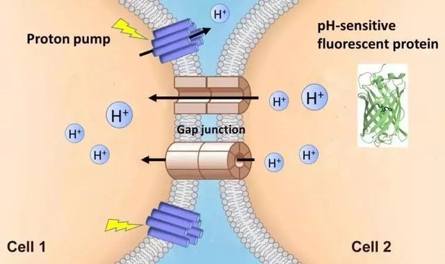 PARIS包含兩部分:第一部分是一個光控質子“泵”(ArchT),它將氫離子輸送出細胞;第二部分是一個熒光傳感器(質子敏感型熒光蛋白pHluorin,所用AdV-pHluorinCAAX腺病毒由維真生物提供),存在于接收信號的細胞內,它對流出的氫離子做出反應。將二者分別表達在縫隙連接耦合的細胞中,通過光激活質子泵產生跨細胞的質子梯度,再通過pHluorin的熒光變化檢測兩個相鄰細胞間的縫隙連接通訊(如圖5所示)。