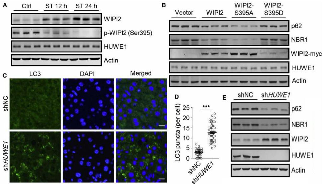 在這里,我們重點展示作者體內生理功能的科研成果,這部分研究涉及到模擬磷酸化和非磷酸化突變體的構建,而且非常榮幸的是,本部分研究所用AAV產品由維真生物助力。首先,作者饑餓處理小鼠12h&24h,通過Western Blot發現肝臟中的WIPI2蛋白量增加,而磷酸化的WIPI2卻減少。為了獲得WIPI2磷酸化調控小鼠肝自噬的直接證據,作者使用rAAV-WIPI2, rAAV-WIPI2-S395A, or rAAV-WIPI2-S395D腹腔注射小鼠,4周后發現WIPI2-S395A蛋白量增加,而WIPI2-S395D卻減少;而且,與WT-WIPI2相比,WIPI2-S395A而不是WIPI2-S395D明顯降低了P62和NBR1的蛋白量。此外,腹腔注射rAAV-shHUWE1的小鼠LC3 puncta、WIPI2的蛋白量和P62&NRB1的降解均表現出了增加(圖4)。