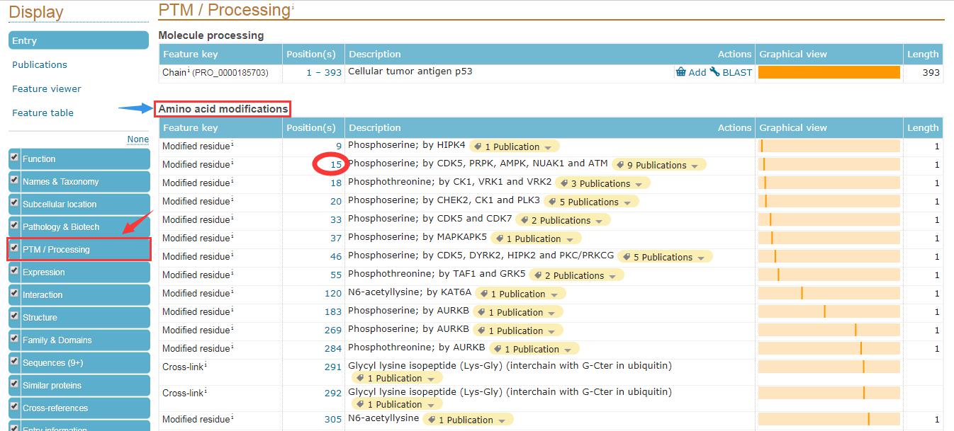(3)點擊人源p53蛋白在數據庫中的編號“Q04637”(上圖紅色箭頭所示),查看專家注釋。這里重點介紹“PTM/Processing”。點擊下圖左邊紅色箭頭指向的“PTM/Processing”欄查看分子加工、氨基酸修飾、翻譯后修飾、蛋白組學數據庫、翻譯后修飾數據庫和參考文獻。