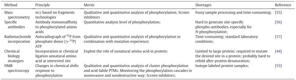 蛋白質磷酸化的分析和磷酸化位點的鑒定已成為目前蛋白質組學研究的關注點之一。目前蛋白質磷酸化的檢測方法主要有特異性抗體(如western blot)、p32放射性標記、質譜、化學生物相結合、核磁共振等。每種方法有其各自的優缺點(表2),研究人員可根據實驗設計挑選合適的檢測方法。