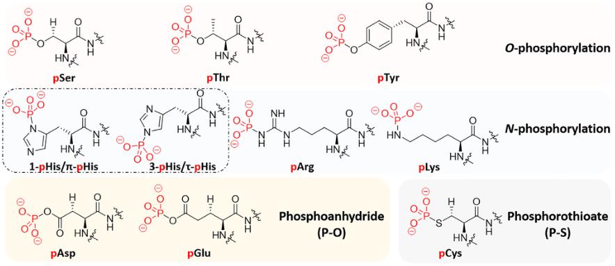 蛋白磷酸化是生物體內普遍存在的一種調節方式。據報道,人類基因組編碼的21000個蛋白質中,90%以上發生了磷酸化。根據被磷酸化的氨基酸殘基不同,蛋白質磷酸化可分為 4 大類,具體分類和磷酸化位點見表1,磷酸化的9個氨基酸分子式見圖2。超過三分之一的蛋白磷酸化發生在絲氨酸、蘇氨酸和酪氨酸殘基上:其中絲氨酸殘基最多(86.4%),其次是蘇氨酸殘基(11.8%),酪氨酸殘基最少(1.8%)。絲氨酸、蘇氨酸和酪氨酸的磷酸化組成了O-磷酸化。O-磷酸化在酸性條件下非常穩定,因此在細胞生物學和磷酸化蛋白質組學中研究廣泛。而N-磷酸化由于不穩定導致其檢測極具挑戰性。加之,催化N-磷酸化的蛋白激酶和蛋白磷酸酶的缺乏進一步限制了它的研究。其他兩類磷酸化(S-磷酸化和酰基磷酸化)的研究報道卻少之又少。