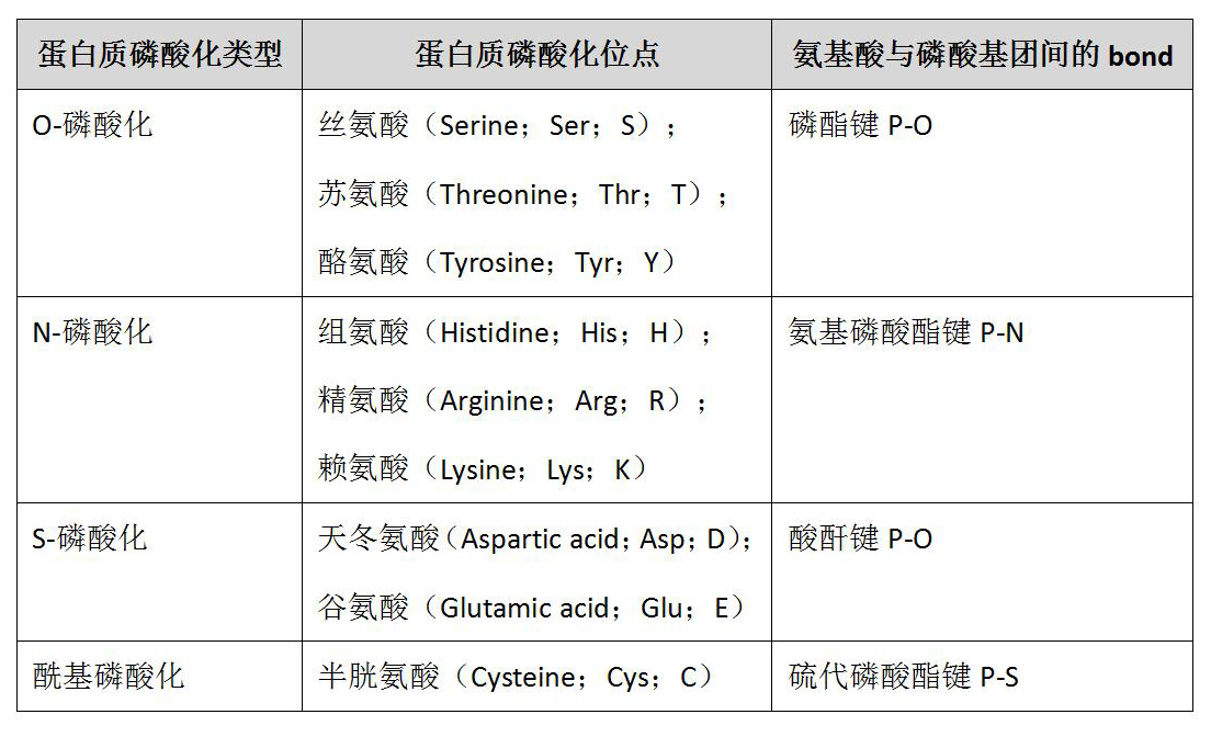 在人類基因組中,大約2%的人源基因編碼518個蛋白激酶。根據其磷酸化的氨基酸殘基不同,蛋白激酶可以分為五大類:絲氨酸/蘇氨酸蛋白激酶、酪氨酸蛋白激酶、組氨酸/賴氨酸/精氨酸蛋白激酶、半胱氨酸蛋白激酶和天冬氨酸/谷氨酸蛋白激酶。
