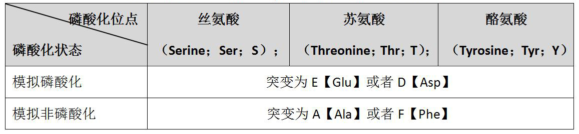 蛋白質的磷酸化導致磷酸基團受體氨基酸殘基上增加了凈負電荷(pSer,pThr和pTyr帶2個負電荷【見上述圖2】)。而取代的酸性氨基酸(Glu和Asp)的負電荷側鏈在一定程度上模擬了蛋白質中磷酸基團的添加,且長度相似。為了使得實驗結果準確,除了構建模擬磷酸化的突變體外,模擬非磷酸化的點突變構建也是必需的,即磷酸基團受體氨基酸殘基被一個不帶電的和不能磷酸化的氨基酸殘基所取代。目前,Ala和Phe已成功模擬非磷酸化。