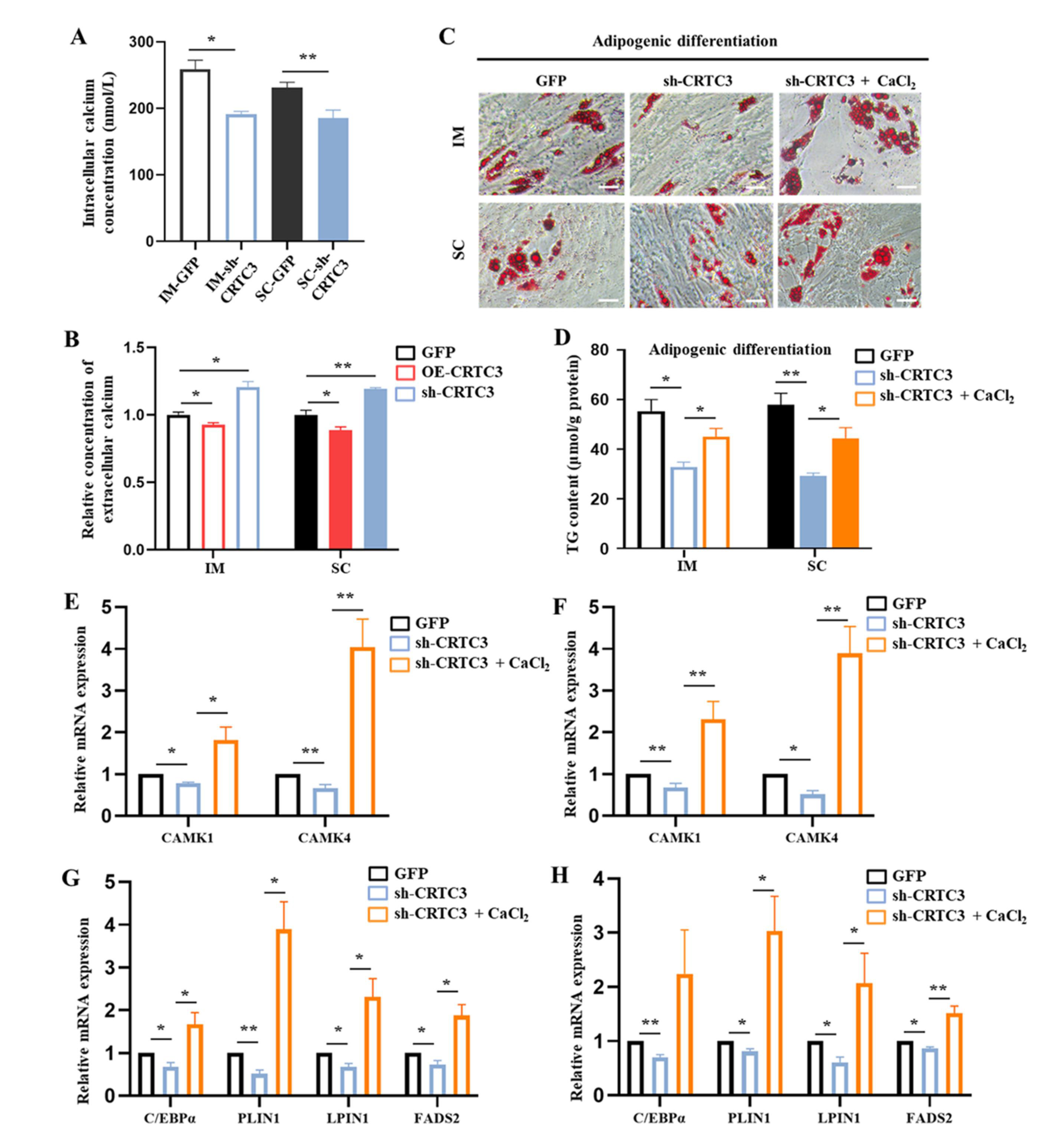 為證實上述觀點,研究者在脂肪細胞中對CRTC3基因表達進行了干擾。與預期一致,低表達CRTC3不影響IM或SC脂肪細胞的形態,但抑制細胞內鈣含量,且脂質積累和甘油三酯含量顯著降低。接著,研究者利用CaCl2進行補救,發現CaCl2處理后,低表達CRTC3基因的脂肪細胞內鈣離子、CAMK1和CAMK4以及脂肪沉積相關基因的顯著升高,這些結果進一步證明CRTC3可能通過鈣信號通路影響IM和SC脂肪細胞的成脂分化。
