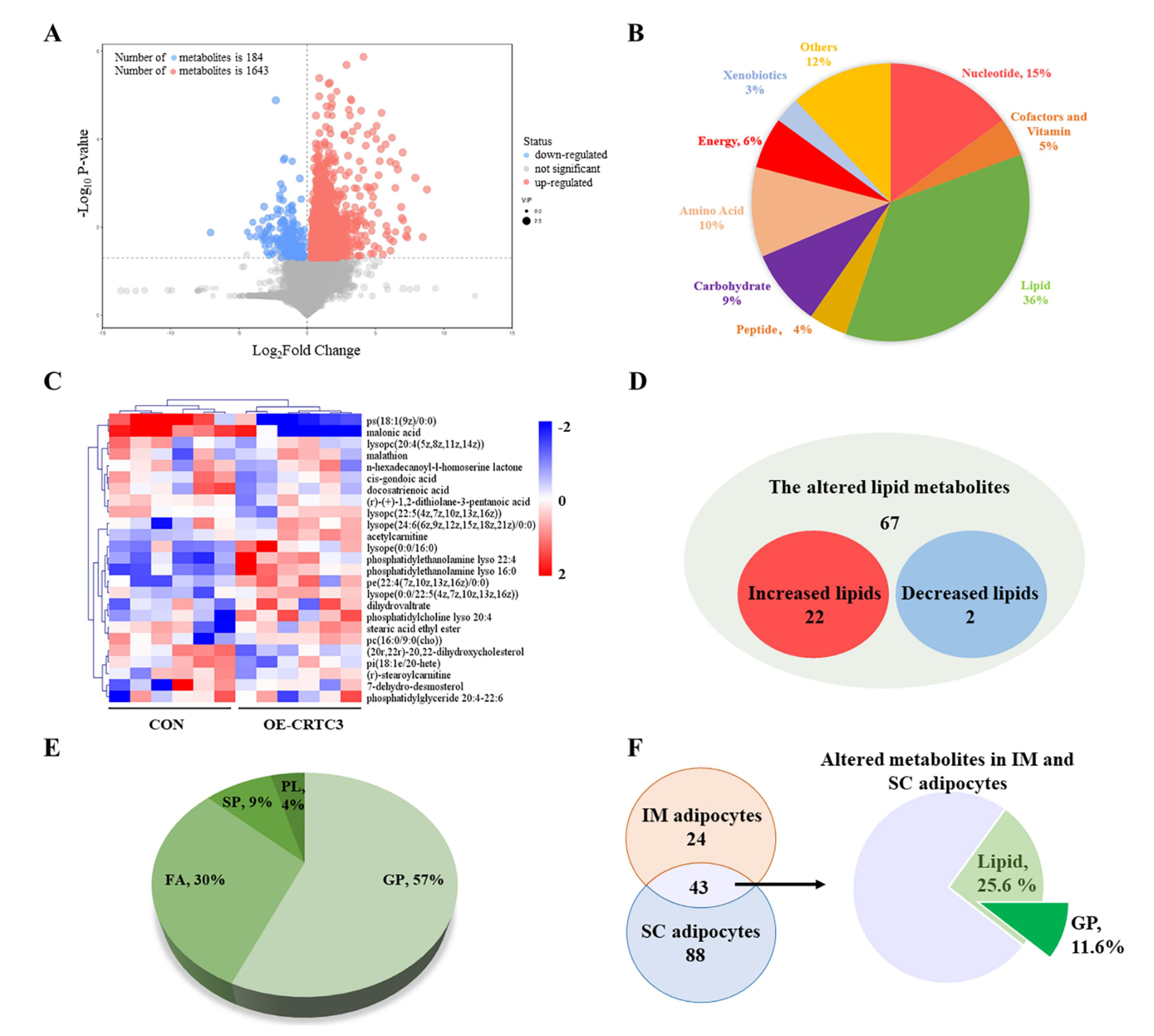 首先,從三日齡的豬中分離出肌內(IM)和皮下(SC)脂肪細胞,利用腺病毒對CRTC3基因進行過表達和干擾。應用非靶向代謝組學分析脂肪細胞中代謝物的變化,通過質譜等方法鑒定出顯著改變的代謝物,對其中變化更顯著的脂質代謝物的亞類進行分析。利用RNA seq闡明IM脂肪細胞的轉錄變化并繪制與代謝相關的路徑圖,確定差異表達基因(DEG),揭示CRTC3參與脂質代謝和成脂分化的調控途徑。
