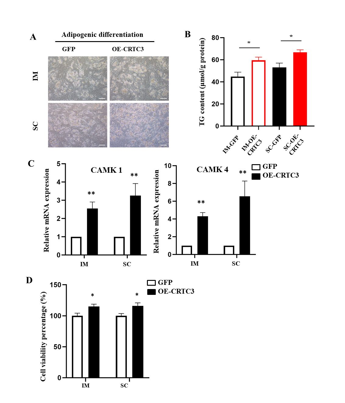 根據脂肪組織的位置,可分為皮下(SC)脂肪、肌內(IM)脂肪和內臟脂肪。SC脂肪和IM脂肪都是由大量的脂肪細胞組成,這些脂肪細胞線粒體很少,可以儲存能量。然而,SC脂肪細胞和IM脂肪細胞在許多方面也有不同的特點。該團隊已經通過先前研究發現CRTC3過表達改變了SC脂肪細胞的代謝物組成以及基因的表達,因此本研究旨在探究CRTC3在豬IM脂肪細胞中的代謝及其轉錄調控作用,以及CRTC3對豬脂肪細胞的調控機制。