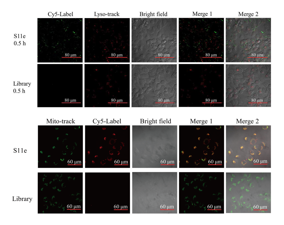首先,作者利用流式細胞術檢測HT1080與已有的具有已知序列的核酸適體的結合能力,成功的鑒定到與HT1080有高親和力的S11e。接著,分析探討了S11e在HT1080細胞中的細胞器共定位,發現溶酶體追蹤器和cy5標記的S11e的熒光信號沒有重疊,線粒體熒光探針Mito-tracker和cy5標記的S11e熒光信號在4℃完全重疊,表明S11e可以定位于HT1080細胞的線粒體。此外,S11e可以在不被溶酶體內化的情況下成功逃逸到線粒體中,使S11e成為一種極好的潛在載體,可以保護自己免受溶酶體中各種消化酶的降解。