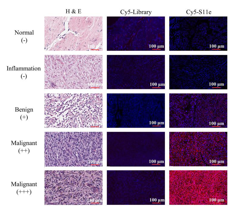 作者進一步通過將Cy5和Cy5標記S11e與纖維組織病理切片共同孵育,發現正常組織中未見紅色Cy5熒光信號,良性腫瘤組織中可見輕微紅色熒光信號,惡性腫瘤組織中可見強紅色熒光信號,表明S11e在體外可以識別纖維肉瘤組織。