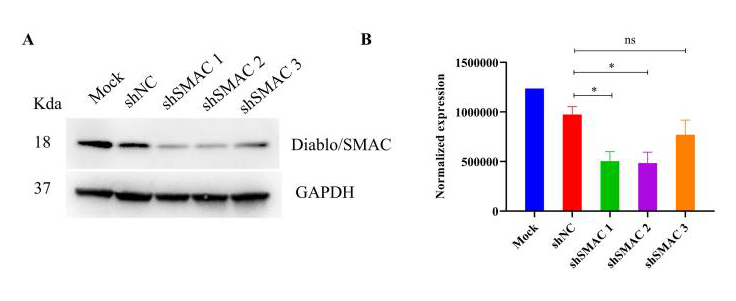 為證實上述推測,作者使用三條獨立的Diablo/SMAC特異性shRNA進行了功能缺失分析,其中shSMAC 1和shSMAC 2對Diablo/SMAC干擾效果更加顯著。