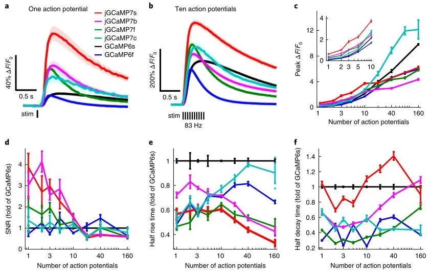 自2001年GCaMP1問世以來,科學家們通過基于結構的突變和基于神經元的篩選方法不斷優化GCaMP的親和性、信噪比、動力學和動態范圍等,先后成功開發過GCaMP2, GCaMP3, GCaMP5和GCaMP6,以滿足研究者不同的成像實驗。其中,GCaMP6系列鈣指示劑憑借其獨特的優勢曾經一段時間獲得科研工作者的青睞。它可以檢測單個動作電位,也可以檢測大量神經元活動和神經亞細胞(如樹突棘和軸突)活動。但是,GCaMP6只有在適宜條件下才能檢測單個動作電位,若處于具挑戰性的條件下,GCaMP6的檢測準確性就會下降。這就需要新一代GCaMP鈣指示劑——jGCaMP7系列來解決,其研究成果科學家們已于2019年7月發表在Nature Methods上。
