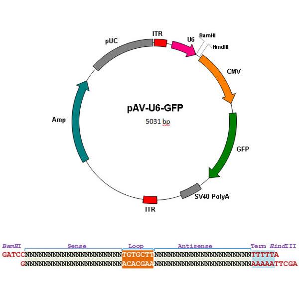維真已預設27000多個人源基因的siRNAs。針對各個基因,維真設計了4條siRNAs,并以莖環結構”Sense-loop(TTCAAGAGA)-Antisense”裝載至pAV-U6-GFP。該產品70%效果承諾,省時省力,數量眾多。此外,維真還可為您提供專屬的shRNA克隆服務和基因沉默效果檢測服務,服務內容多種多樣,歡迎咨詢選購!若宿主細胞難感染,除通過質粒形式遞送shRNAs外,科研工作者還可以通過維真的病毒載體(AdV、LV和AAV)將其導入宿主細胞,實現目的基因體內外的沉默表達。